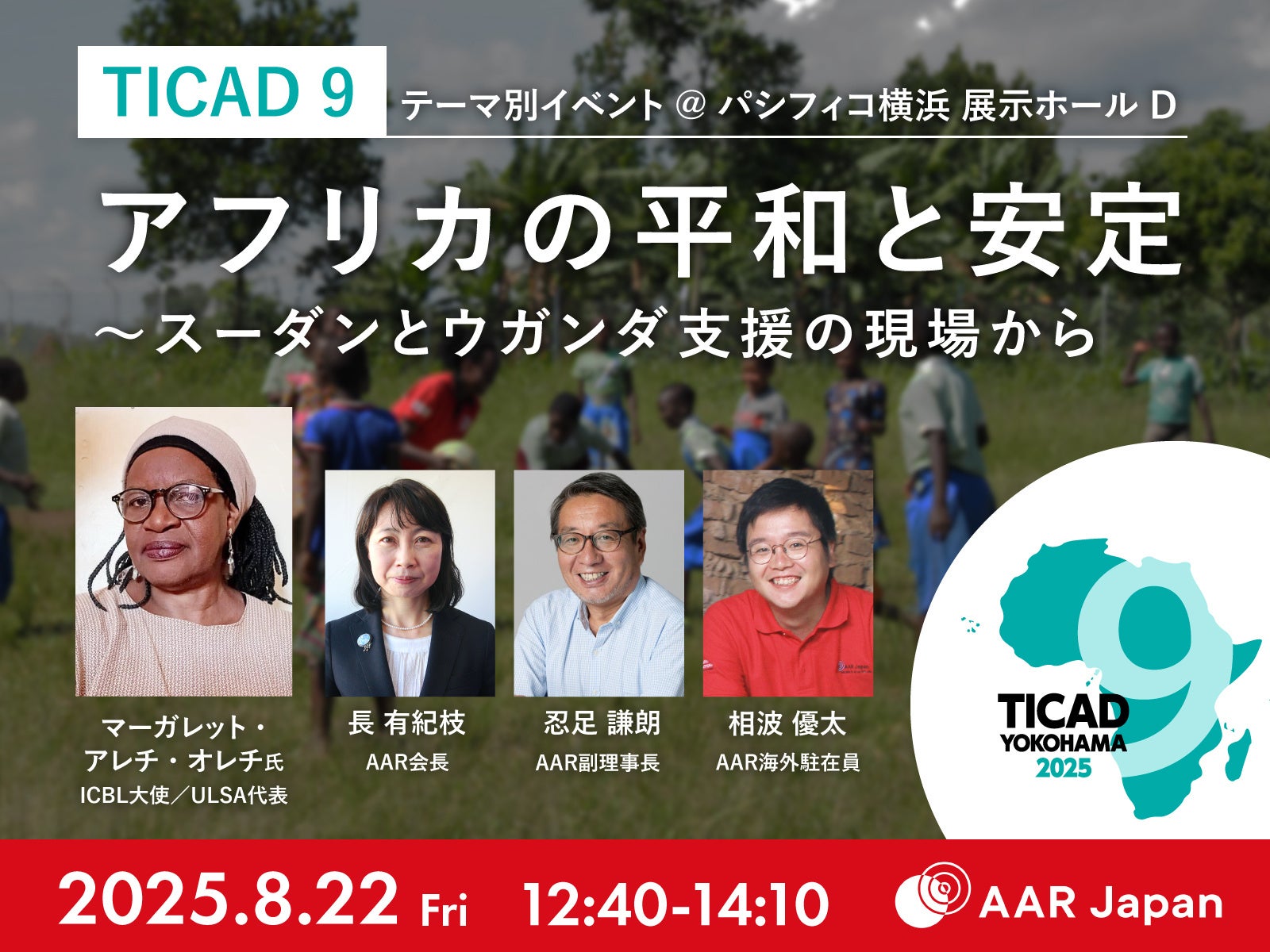 日本生まれの国際NGO、AAR Japan[難民を助ける会]は8月22日、第9回アフリカ開発会議(TICAD9)のテーマ別イベントとして、シンポジウム「アフリカの平和と安定~スーダンとウガンダ支援の現場から」を開催します。自らも地雷被害者であり、アフリカの地雷廃絶運動のリーダー、マーガレット・アレチ・オレチさんの講演を中心に、アフリカの平和と安定のために日本とNGOに求められること、私たち市民にできることについて考えます。