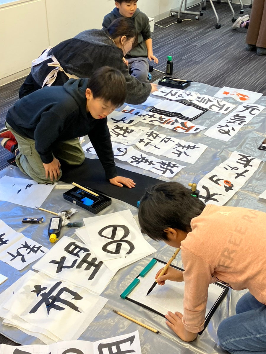 当日はパパ・ママ社員が子どもを連れて出社し、社内で書道が得意な社員(講師)が子どもたちの毛筆・硬筆の指導を行いました。子どもたちは講師社員の指導のもと、真剣な表情で筆を持ち、とめやはらいなどの基本を学びながら、自分なりのペースで文字を書き上げました。家庭で行うとなると道具の準備や片付けが大変な「書き初め」ですが、社内でまとめて取り組むことで、“とても助かった”という声が多く寄せられています。