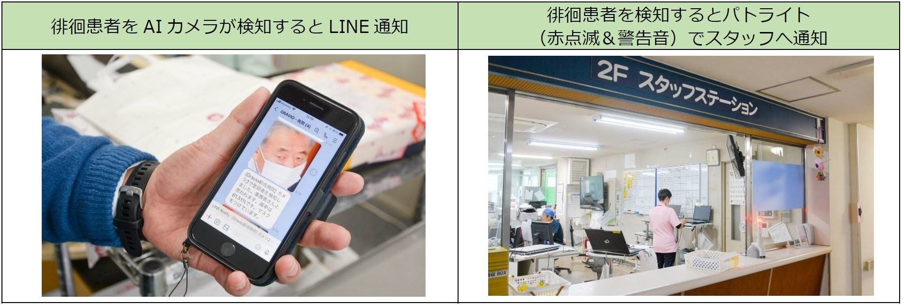 「徘徊検知ソリューション」は、院内に設置された顔認証AIカメラ(2台)とIoTセンサー(2個)が入院患者を24時間常時見守る体制を構築。認知症患者の徘徊や譫妄(せんもう)による異常行動、無断外出等を検知すると、看護師のスマートフォンにLINEで即時通知されるとともに、スタッフステーションに設置されたパトライトから警報が発出されます。