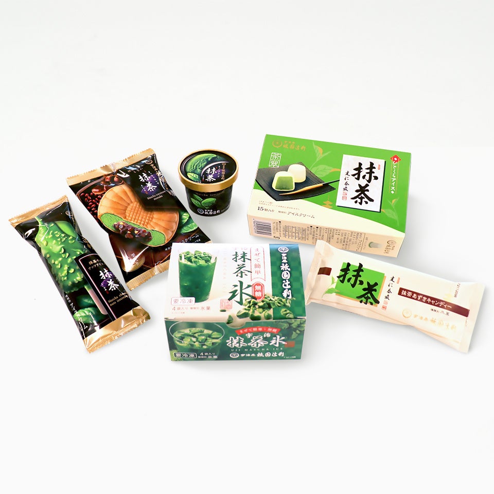 原材料を見直し、良質な宇治抹茶の風味を存分に感じられる「抹茶アイスクリーム(カップ)」と、抹茶とチョコとナッツの絶妙なバランスが自慢の「抹茶チョコナッツアイスバー」、栗入り小倉あんと抹茶アイスがぎっしり詰まった「抹茶アイスもなか」、一口アイスクリームとあずきキャンディ-など定番の抹茶アイスに加え、無糖の抹茶をそのまま氷にした「抹茶氷」をセット。くちどけや風味の違いを感じられる、バラエティ豊かな宇治抹茶のアイスセットです。