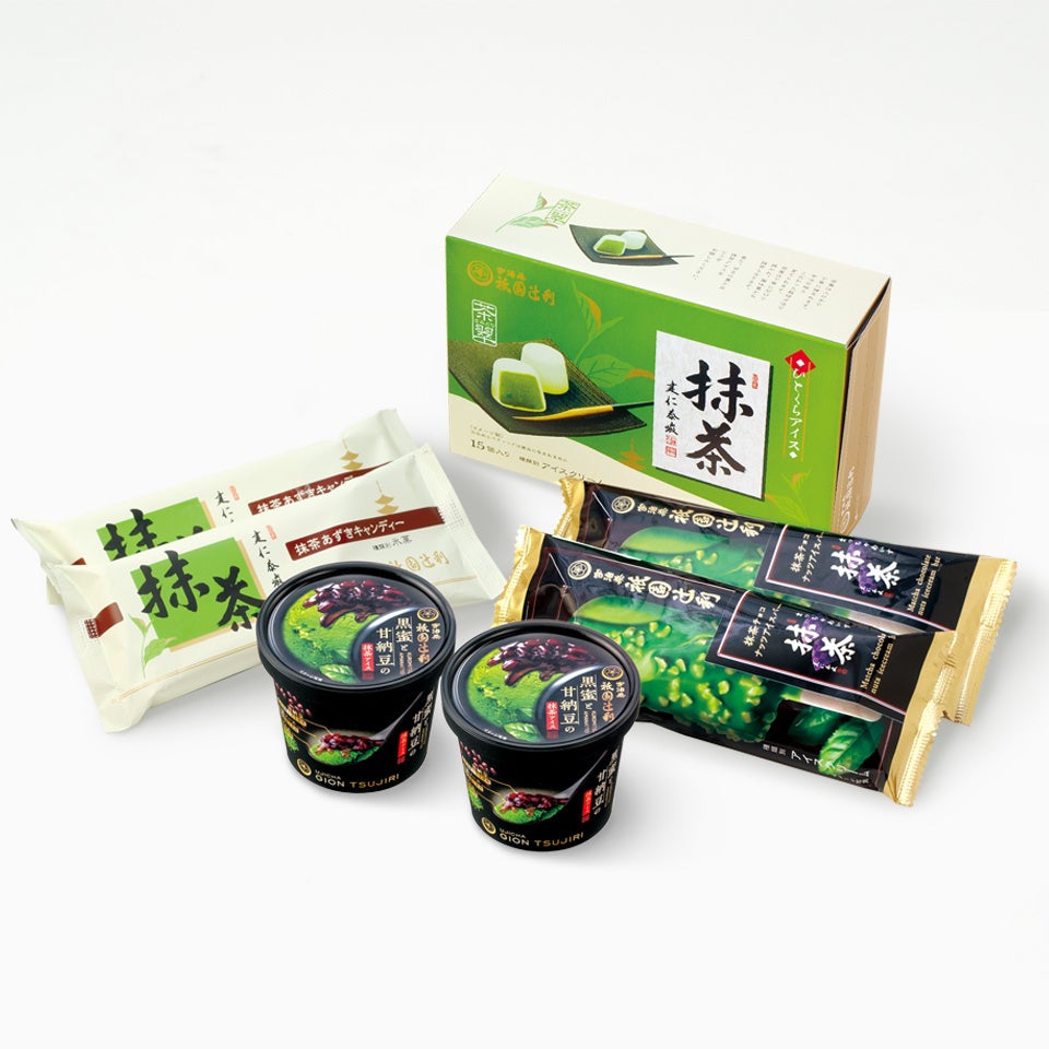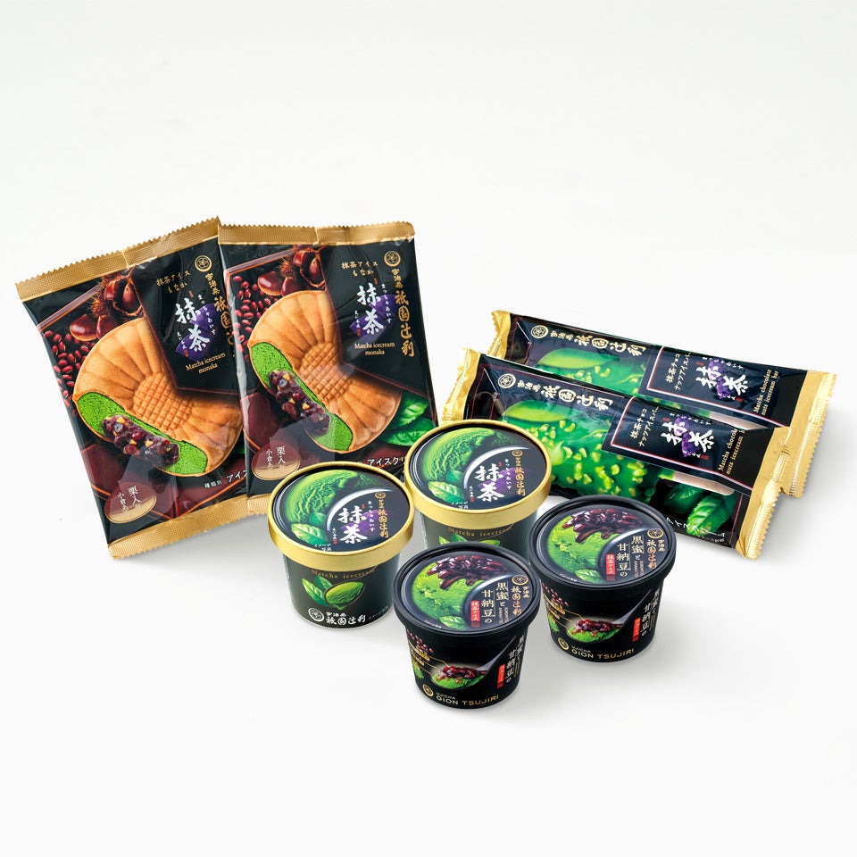 新発売の「黒蜜と甘納豆の抹茶アイス」をはじめ、良質な宇治抹茶の風味を存分に感じられる「抹茶アイスクリーム(カップ)」、抹茶とチョコとナッツの絶妙なバランスが自慢の「抹茶チョコナッツアイスバー」、栗入り小倉あんと抹茶アイスがぎっしり詰まった「抹茶アイスもなか」をセット。抹茶アイスを極める方に味わっていただきたい、濃厚さを存分に感じられるセットです。