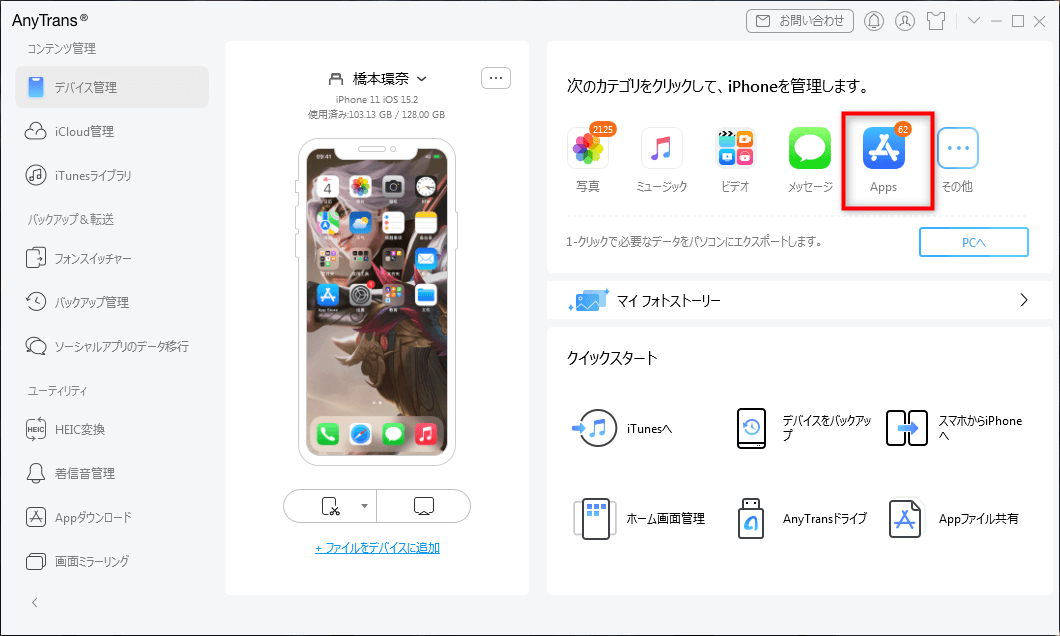 2. AnyTransを起動して、メイン画面で「アプリ」を選択します。