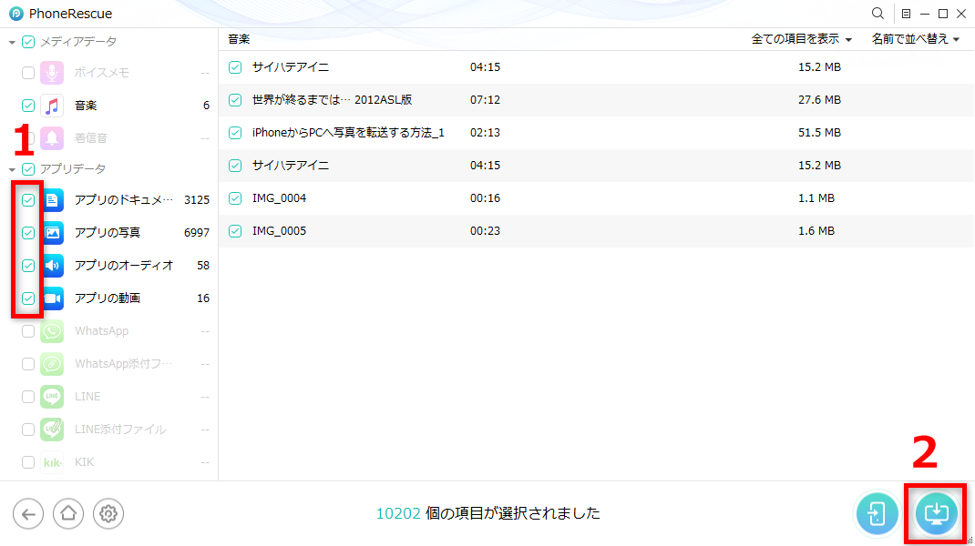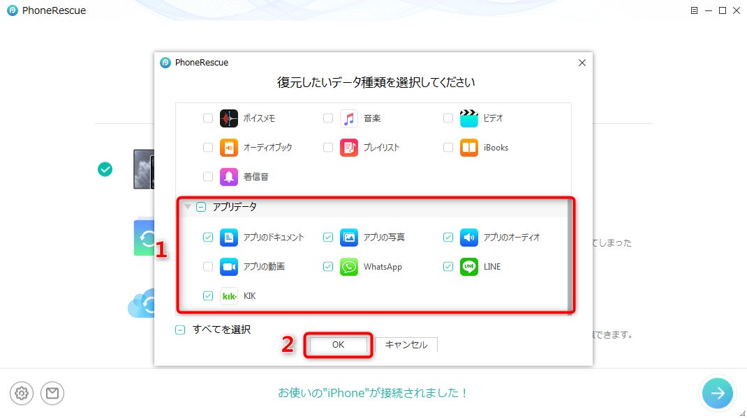 PhoneRescueを使用して、iPhoneからアプリ内のファイルを取り出す方法は以下の通りです。