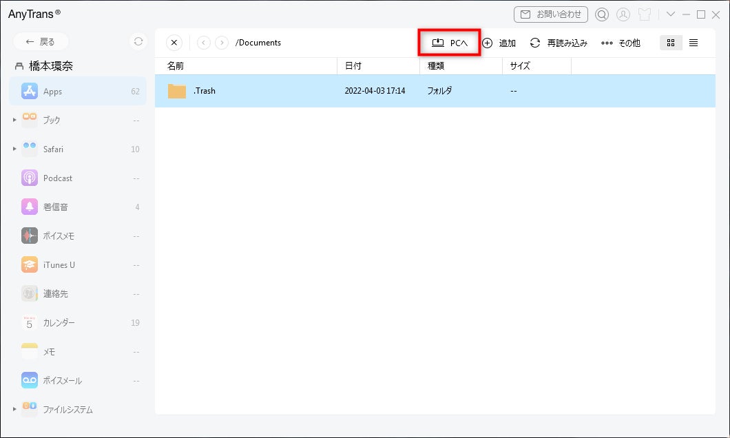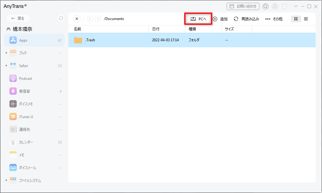 AnyTransでiPhoneからアプリ内のファイルを取り出すには、以下の手順に従ってください。