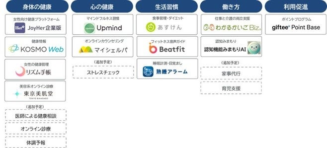 ダイエット、フィットネス、メンタルケア、介護、フェムテックなどで人気のアプリ・サービスを厳選して提供します。今後は、育児支援、家事代行、オンライン診療などのサービスも順次拡充予定です。
