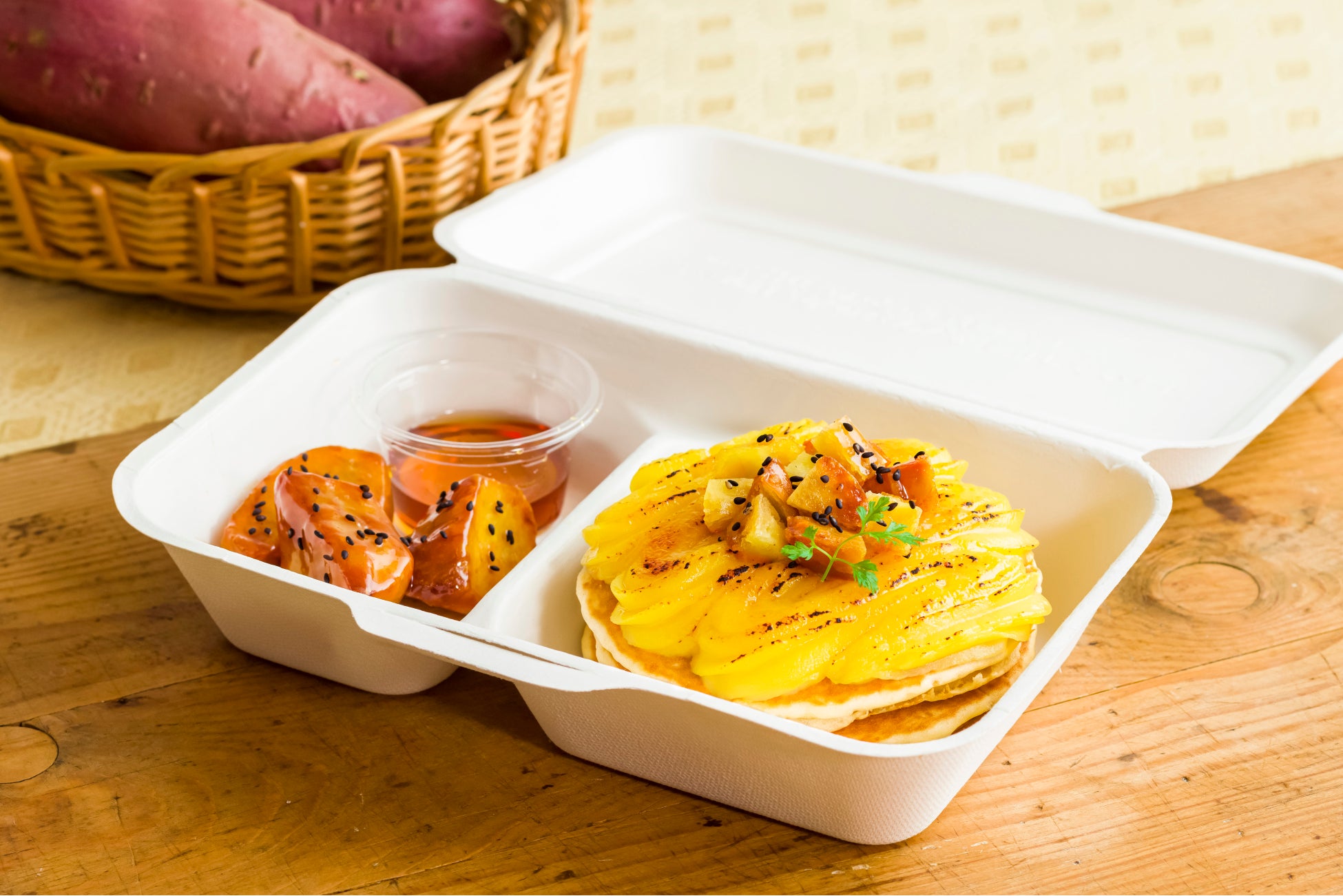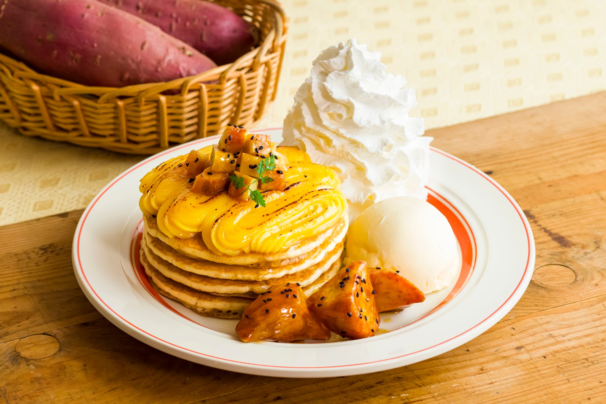 香ばしくキャラメリゼした濃厚なスイートポテトクリームと蜜をたっぷり絡ませた大学いもをのせたパンケーキ。バニラアイスとご一緒にどうぞ!