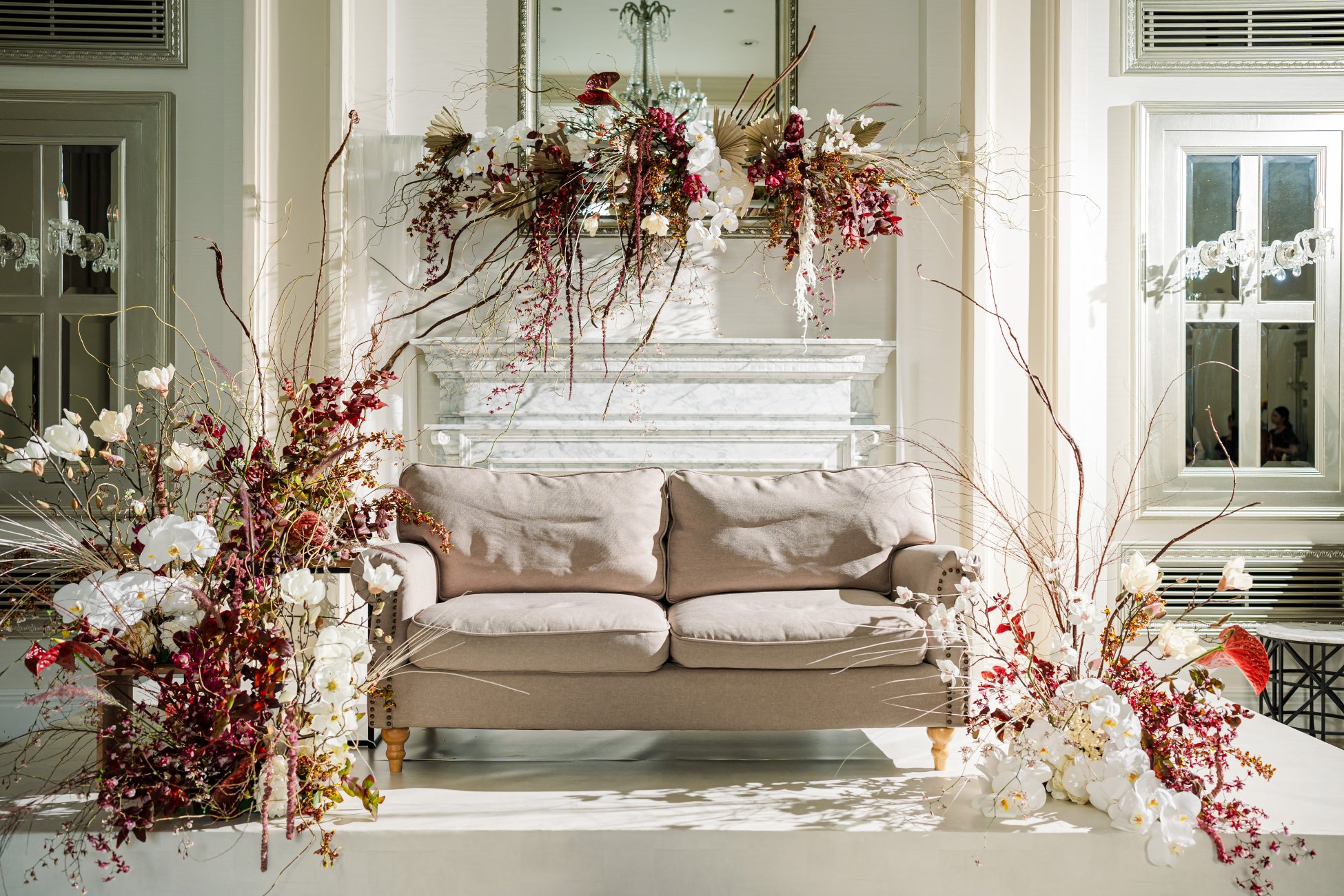 コストパフォーマンス良くパーティの写真映えを追求したいという方も増えているので、フラワーコーディネーターによる披露宴会場の装飾に予算の比重を置き、ウェルカムスペースの装飾をおふたりで準備いただくことを勧めたりします。カップルごとにパーティコンセプトを提案しているため、コンセプトに関連する装飾品を楽しみながら検討いただけます。(麻布迎賓館/木村 はづき)