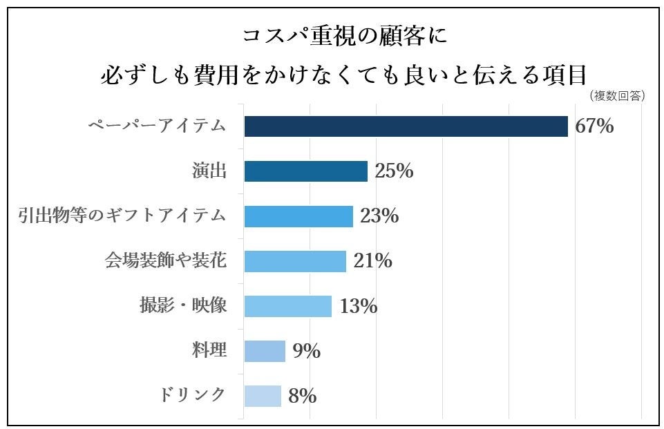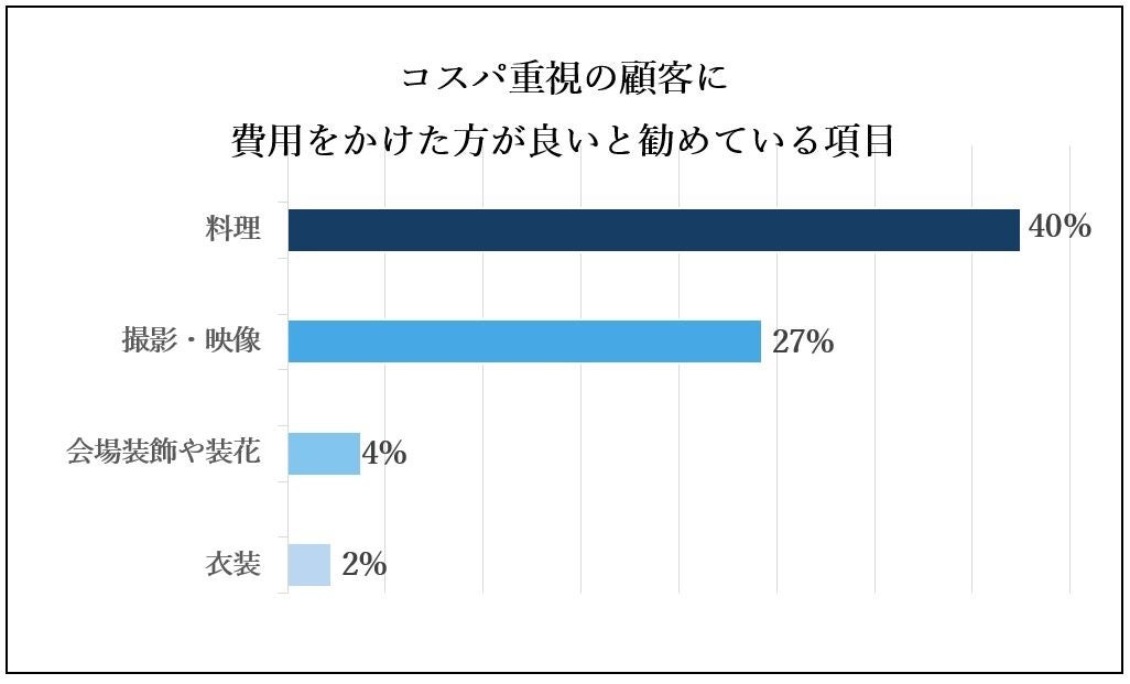 『コスパを重視する顧客に、費用をかけた方が良いと勧めているもの』には、「料理(40 %)」「撮影・映像(27%)」と回答したウェディングプランナーが全体の70%弱にのぼります。一方、『必ずしも費用をかけなくても良いと伝える項目』として、最も多く挙がったのは「ペーパーアイテム(67%)」。準備の効率化やおふたりとゲストの利便性などもあわせて考慮し、WEB招待状&席次表を勧めると多くのウェディングプランナーが回答。おふたりの希望やこだわりをふまえつつ、ゲストの満足度に直結する料理と、結婚式後も長く楽しめる撮影・映像を中心に、費用をかけるポイントと優先順位付けについてアドバイスをしていることが分かりました。