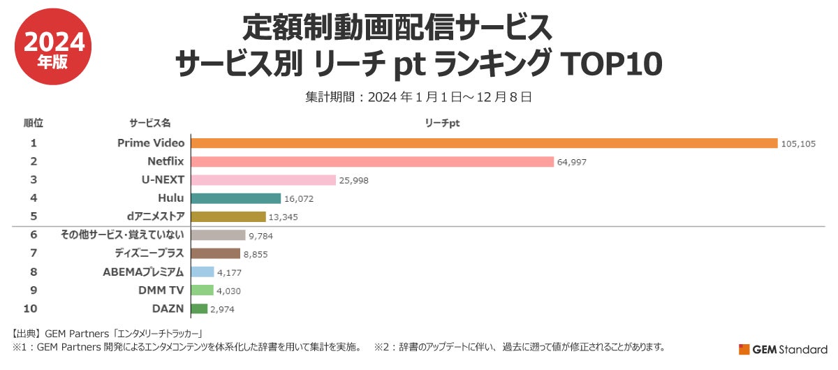 エンタテイメント業界に向けたデータ×デジタルマーケティングサービスを提供するGEM Partners株式会社(ジェムパートナーズ、所在地:東京都港区、代表取締役:梅津文)は、映像、マンガ・書籍、ゲーム、音楽メディアなどのメディアを横断してエンタメブランドの真のリーチを比較・評価することを目指した新指標“リーチpt※1”をもとに、2024年の「定額制動画配信サービス 年間視聴ランキング」を発表いたします※2。メディア横断をはじめ、これまで把握が難しかったサービス横断での真のリーチを明らかにすることを目的としています。