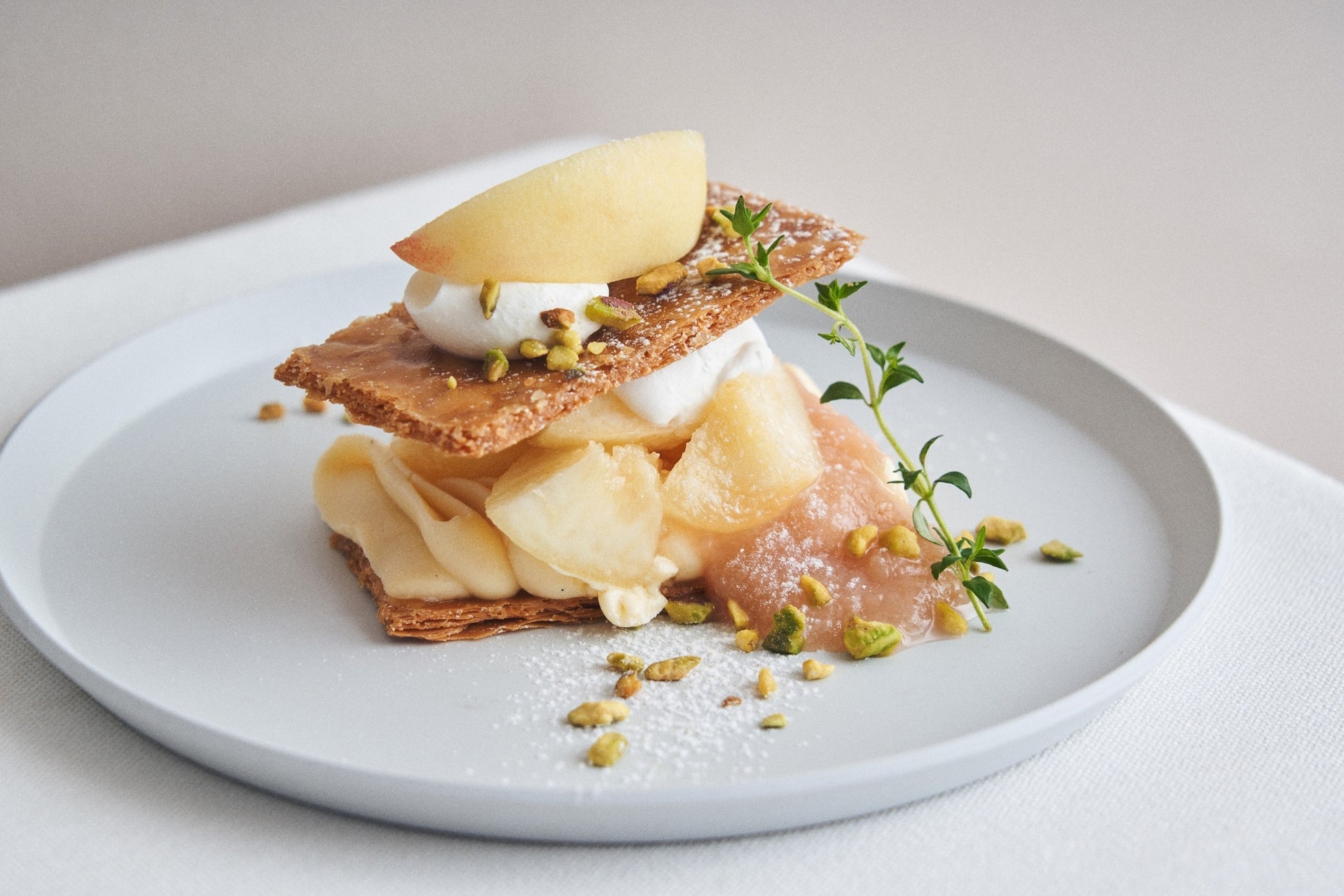 ■“岡山白桃”とサワークリームのミルフィーユ(税込935円)