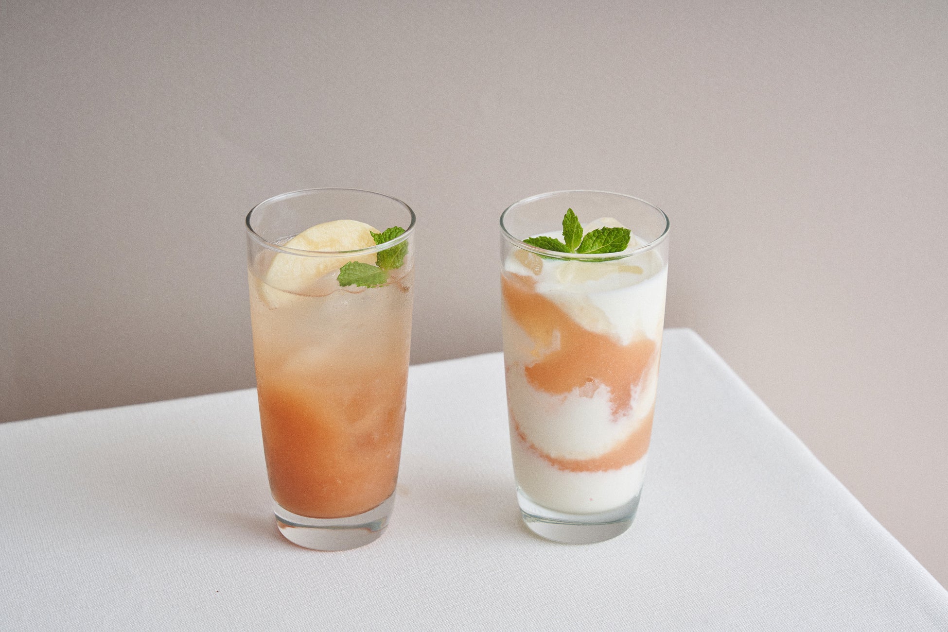 ■(左)“岡山白桃”のティーソーダ(税込880円)