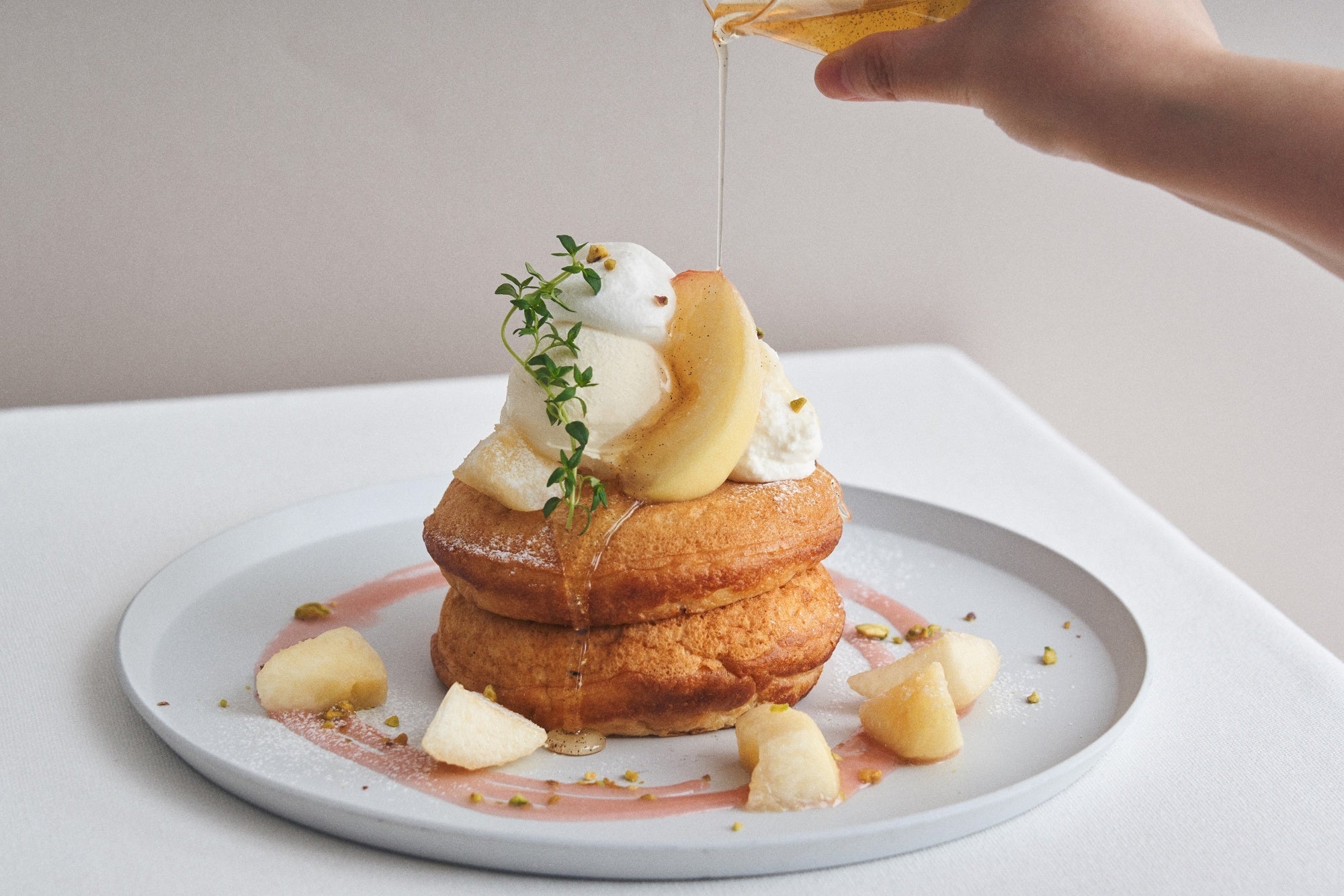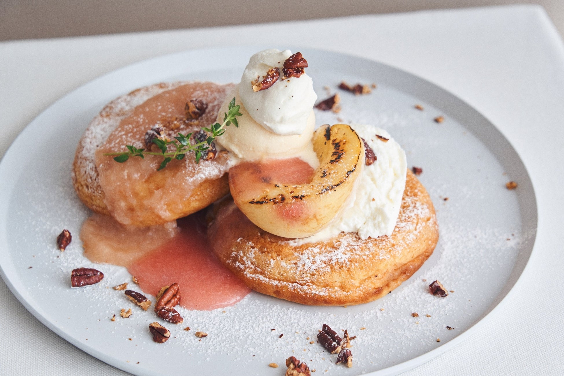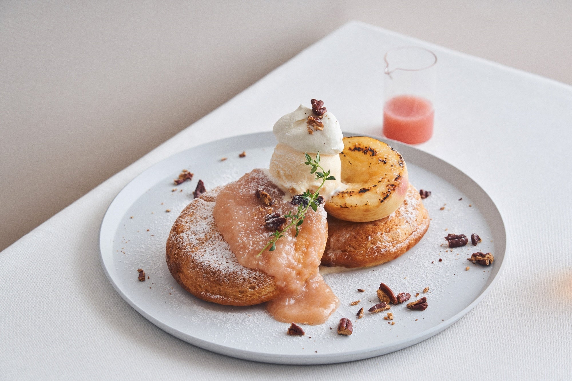 - 甘い桃とさわやかな酸味をもつチーズの組み合わせが嬉しいパンケーキ。
