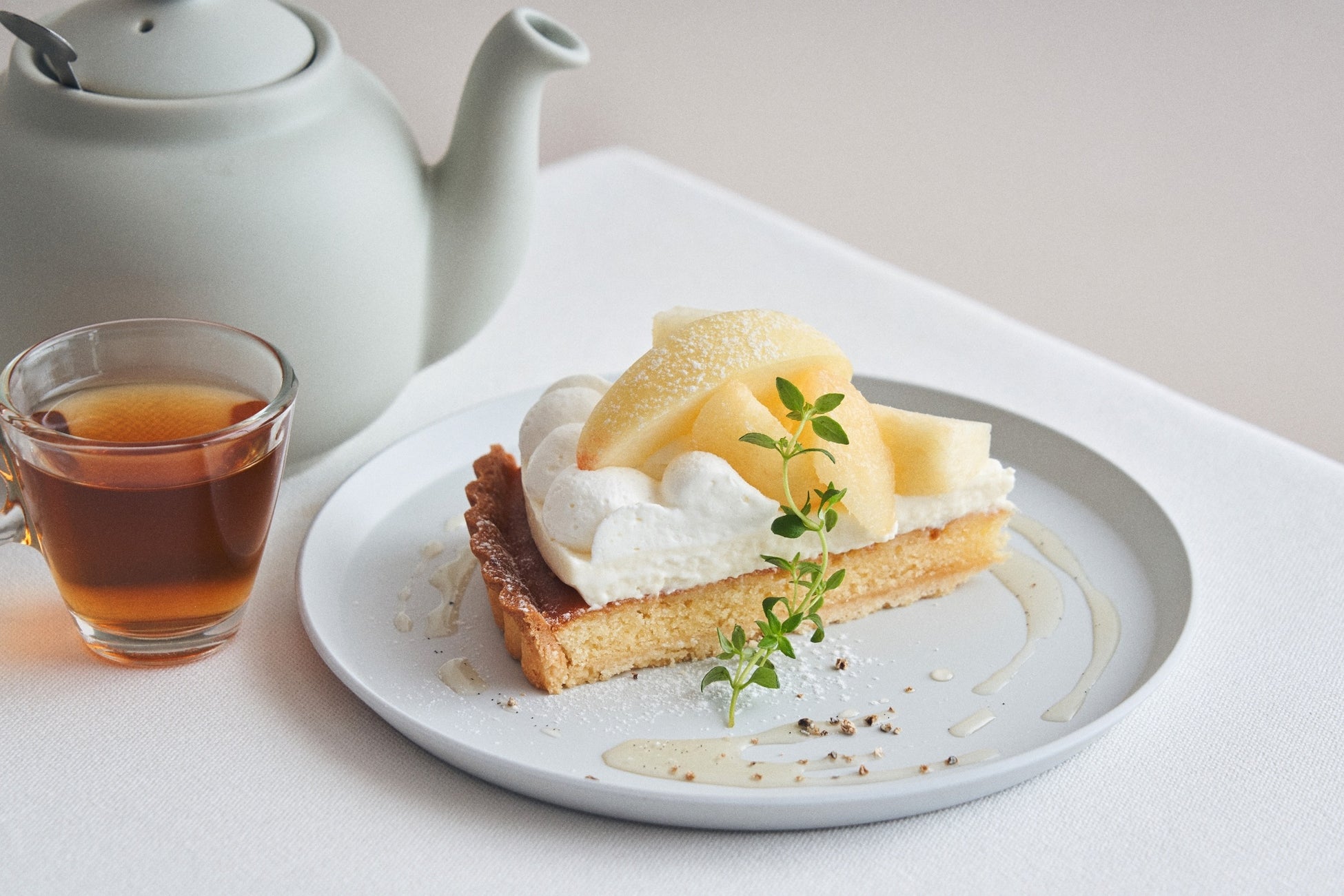 ■“岡山白桃”のレアチーズムースタルト はちみつレモンソース(税込902円)