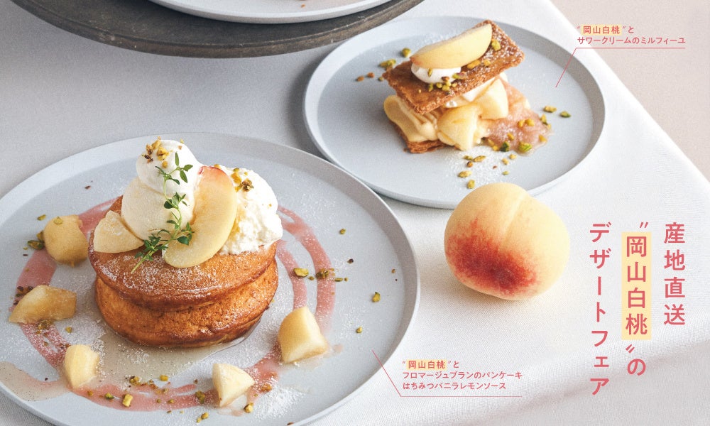 自慢のパンケーキでは、フレッシュピーチとベイクドピーチをアレンジした2種類のメニューを提供するほか、桃一つを贅沢に使用して話題を集めた“まるごとパンケーキ”が岡山白桃バージョンとなって復活。また、ミルフィーユやタルト、クランブルパイなど多種多様な桃デザートを展開いたします。芳醇な香り、やわらかい果肉、上品な甘み。獲れたてのジューシーな岡山白桃をたっぷりとご堪能ください。
