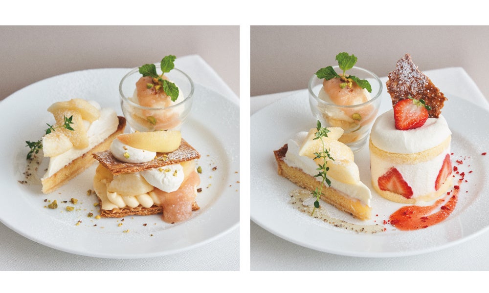 ■(右)いちごショートケーキと“岡山白桃”レアチーズムースタルトのデザートプレート(税込1,540円)