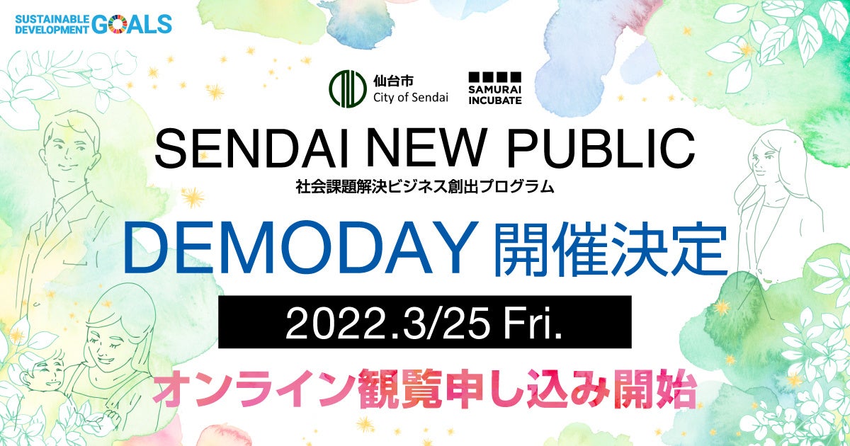 仙台市(市長:郡 和子)と株式会社サムライインキュベート(本社:東京都港区、代表取締役:榊原 健太郎、以下 サムライインキュベート)は、研究成果やICTなど独自のテクノロジー・研究シーズを持ち、それらを社会に役立てていきたいという想いがある方を対象に事業創出を支援するプログラム「SENDAI NEW PUBLIC」を開催しており、採択者7名によるDEMO DAY(成果発表会)を2022年3月25日(金)にオンライン開催いたします。