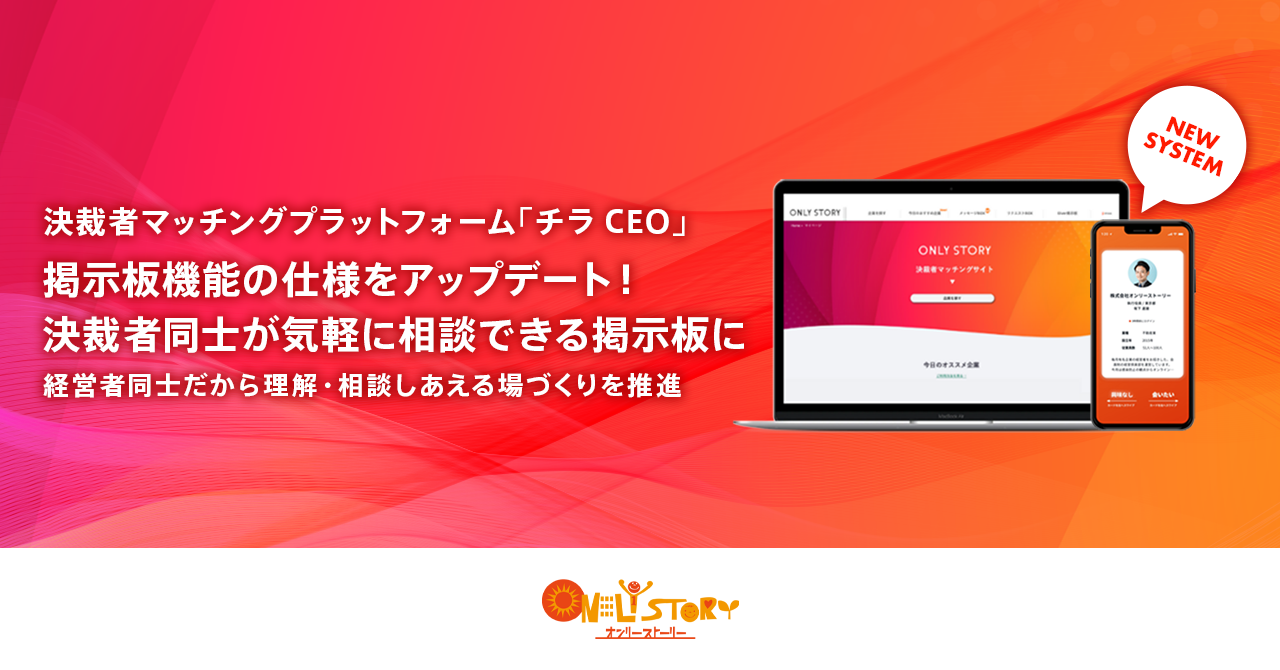 決裁者マッチングマッチングプラットフォーム「チラCEO」を運営する株式会社オンリーストーリー(代表取締役:平野哲也、本社:東京都渋谷区)は、10月3日から実装する新機能情報を発表いたしました。同サービス利用者限定掲示板において、経営課題・事業課題の相談を投稿・閲覧することができるようになります。相談相手や理解者が少なく、孤独と表現される経営者・決裁者に対し、同じ境遇のキーパーソン同士が相談しあえる場づくりを進めてまいります。