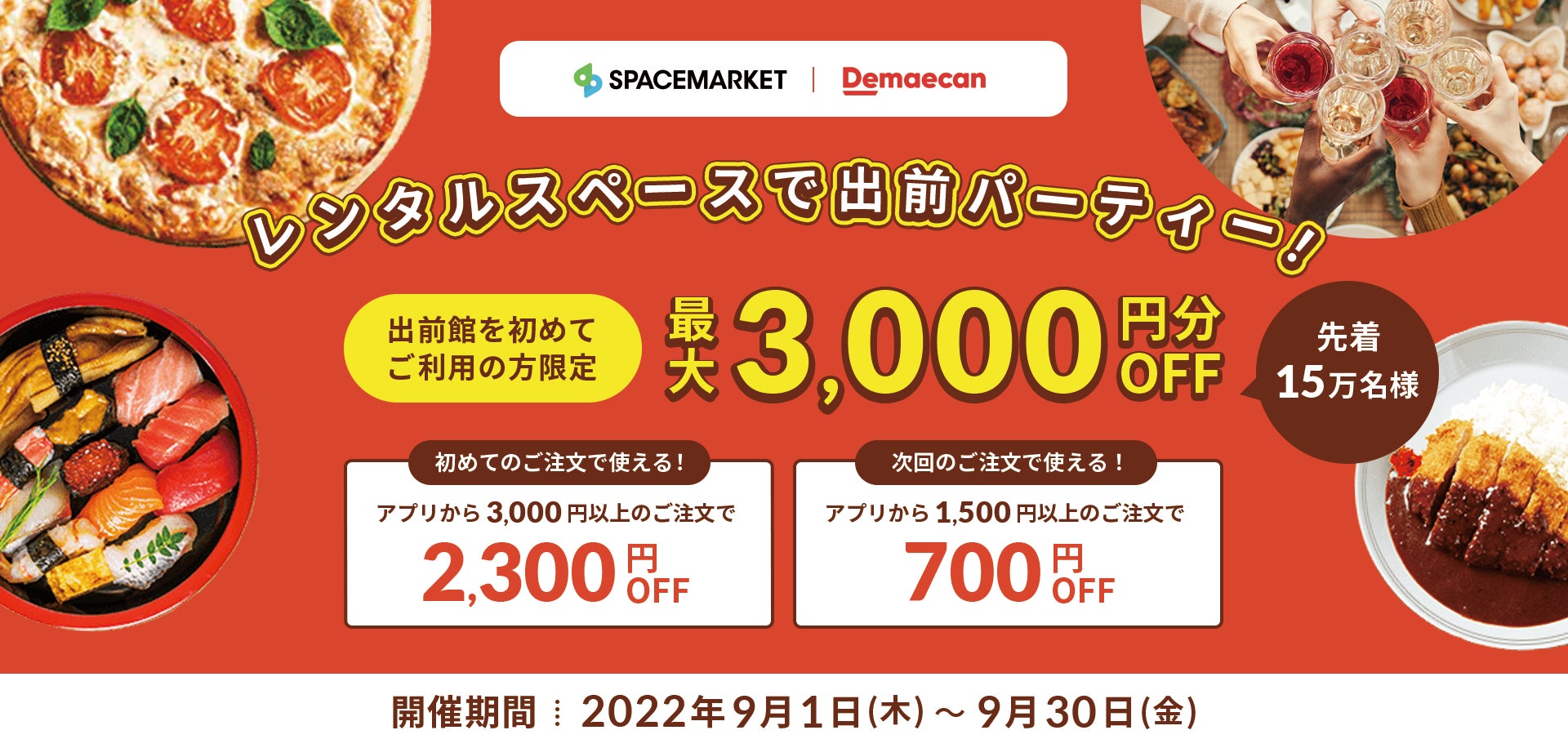 スペースマーケットと出前館の連携を記念して、対象期間中にスペースを予約・利用をした方へ出前館で使える最大3,000円分(※)の割引クーポンをプレゼントします。