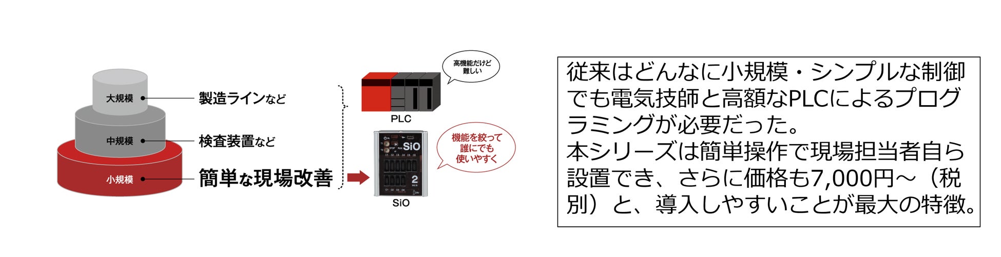SiO コントローラは、専門知識不要の日本語選択式プログラミングで、入力機器(スイッチや各種センサなど)の信号に応じて、出力機器(コンベヤやエアシリンダー、表示灯など)の ON・OFF をシンプルに行う制御装置です。