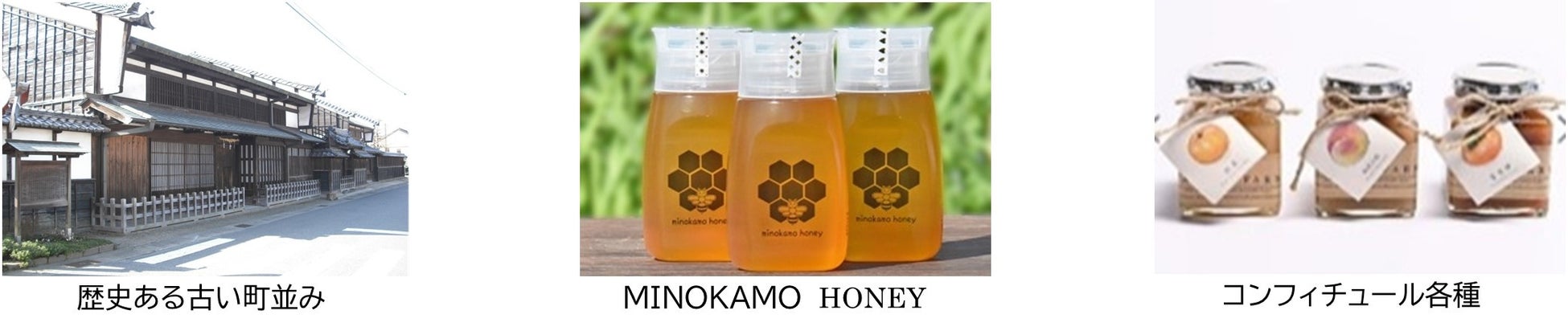 ブース概要 | 美濃加茂市は、江戸時代に中山道の宿場町として栄えた歴史を持ち、今も木曽川沿いに古い町並みが保存された、自然・文化・歴史を大切にしているまちです。今回は、ふるさと納税返礼品人気No.1のはちみつ「MINOKAMO HONEY」をご用意しました。ミツバチが美濃加茂を中心に集めたさまざまな花の蜜によってつくられる「百花蜜」です。「単花蜜」に比べ、味わい深く滋養に富むといわれる希少なはちみつです。その他、地元産コンフィチュールや地酒の試飲をご用意しています。 |