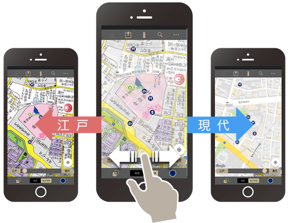 江戸末期の古地図を、人の手による「完全描き起こし」で再現。さらに地図の透過度を自由に変えられる機能も搭載し、スマホ上で容易に現代図と古地図を重ね合わせることができます。スマートフォンや、タブレットでご利用可能です。