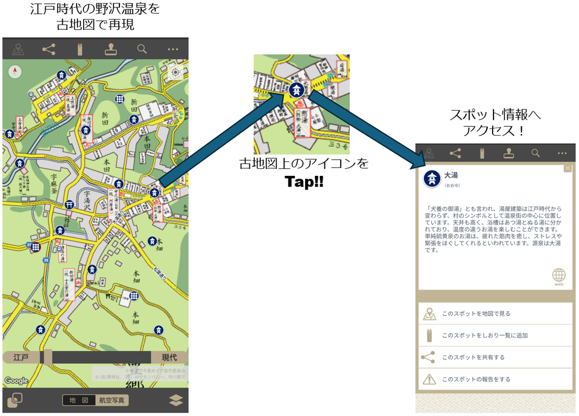 古地図アプリ「大江戸今昔めぐり」が「いつでも訪れたくなる街野沢温泉」の実証実験に参加