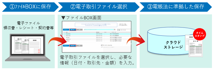 このたび、『かんたんクラウドファイルBOX』において、電子取引に該当するファイル(請求書・領収書・契約書等)を『かんたんクラウドファイルBOX』にアップロードし、電子取引ファイル保存時にタイムスタンプを自動付与する機能を新たに標準機能として搭載します。電子取引ファイルの一覧表示、証憑検索、証憑表示およびダウンロードにも対応し、電子的に授受した書類の電子保存に対応します。(2022年7月予定)