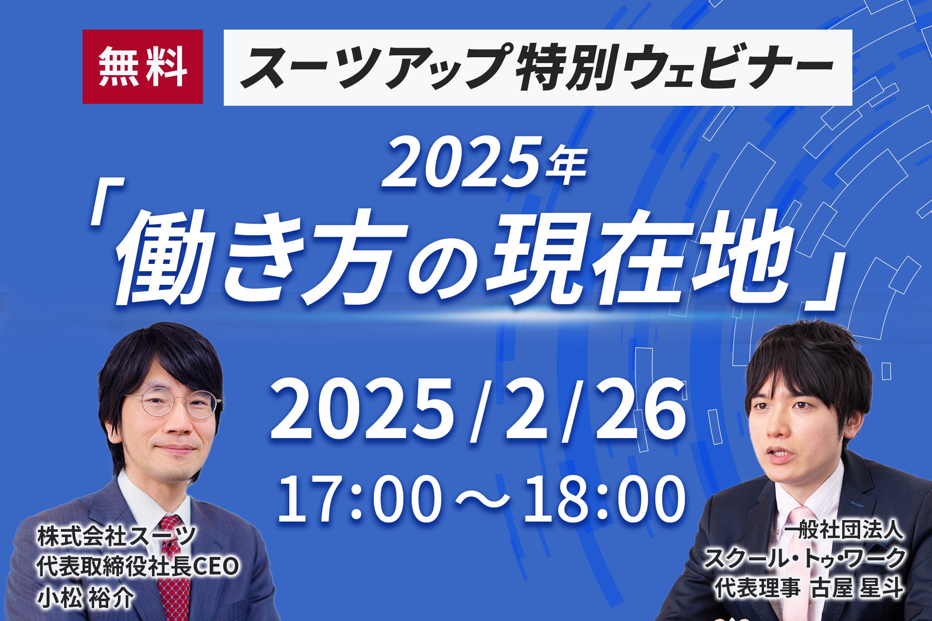 当社では、2月26日(水)17時から、ゲスト講師に、一般社団法人スクール・トゥ・ワーク代表理事の古屋 星斗氏を迎え、第3回目となるスーツアップ特別ウェビナー「2025年の働き方の現在地 ~ 人手不足・キャリアから中小企業DXまで~」を無料開催します。