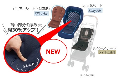 新機能として、本体シートのシルキーエアー(※4) の背中部分の厚みが約30%アップ(※2)し、赤ちゃんの乗り心地がより快適になりました。