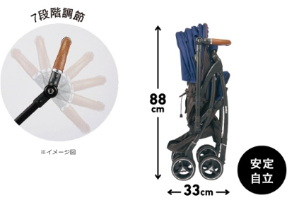 ハンドルの角度を7段階に調節できる「マルチハンドル」は、使う人の身長や状況に合わせて押しやすい高さに自由に調節できます。折りたたんだ時はハンドルが飛び出さないようにコンパクトに収納ができ、自立する設計なので、玄関先などにも収納しやすいです。