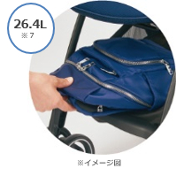 バスケットの間口が広く、出し入れしやすい設計。前後どちらからでも荷物の出し入れができ、荷物が多くなる赤ちゃんとのお出かけに便利なバスケットです。