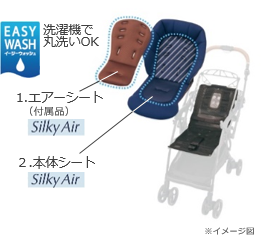 エアーシートと本体シートに採用している通気性に優れた素材「シルキーエアー」は、洗濯機で丸洗い(※6)ができるので清潔に保つことができます。汗っかきな赤ちゃんも一年中快適に過ごせます。