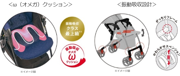 従来機能である車体の揺れや、ぐらつきを抑える溶接が施されたがっちりフレームと、車輪に備わったやわらかサスペンションからなる「振動吸収設計」の上に「ω(オメガ)クッション」を搭載することで、でこぼこ道での振動を軽減します。「ω(オメガ)クッション」は、ソファーのスプリングのようなクッションで、揺れに応じて座面がやさしく上下し、赤ちゃんに伝わる振動を吸収します。これにより、座面部分の振動を最大約37%大幅軽減(※3)、振動吸収クラス最上級(※1)を実現しました。