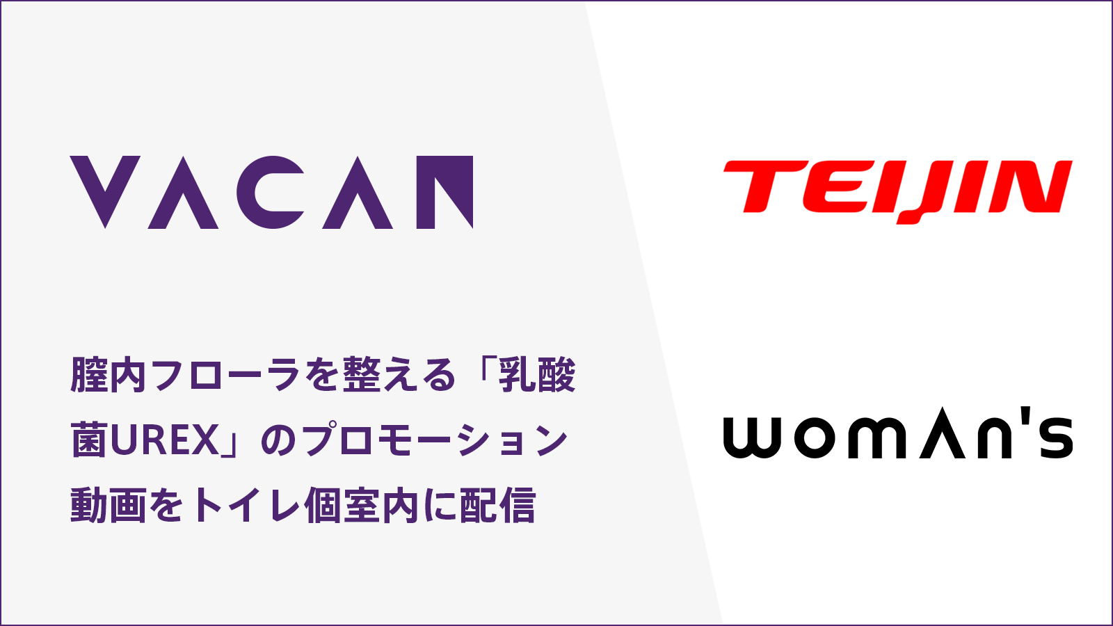 株式会社バカン(本社:東京都千代田区、代表取締役:河野剛進、以下「バカン」)は、女性ヘルスケア市場専門の企業支援を行う「ウーマンズ」(本社:東京都江東区、代表取締役:阿部エリナ)と協業し、帝人株式会社(本社:大阪市北区、代表取締役社長:鈴木 純)が展開する膣内フローラを整える「乳酸菌UREX(※)(ユーレックス)」の啓発動画をトイレ個室内へ2月17日(木)から配信します。配信はトイレの長時間利用抑止IoTサービス「VACAN AirKnock Ads」(エアーノック アッズ、以下 AirKnock Ads)」が導入された、オフィスの女性トイレで行われます。