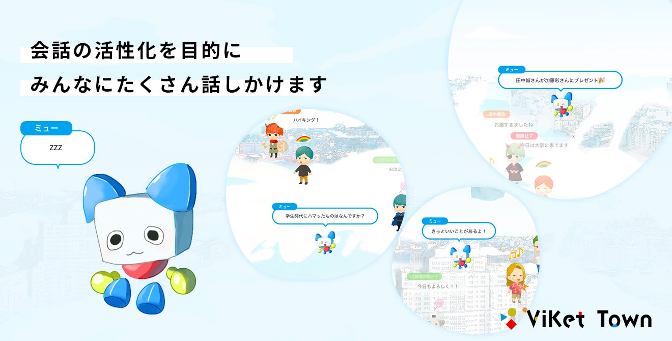 「ViKet Town(ビケットタウン)」を使う様々な方が、このアバターと働く異世界空間プラットホームを通し、働くことをエンタメに=働くことをより良いものにしていきたいという想いを込め、社員をサポートする妖精「ミュー(Myu)」が生まれました。1人でも多くの皆さんの仕事、コミュニケーションの活性化に繋がることを期待しています。