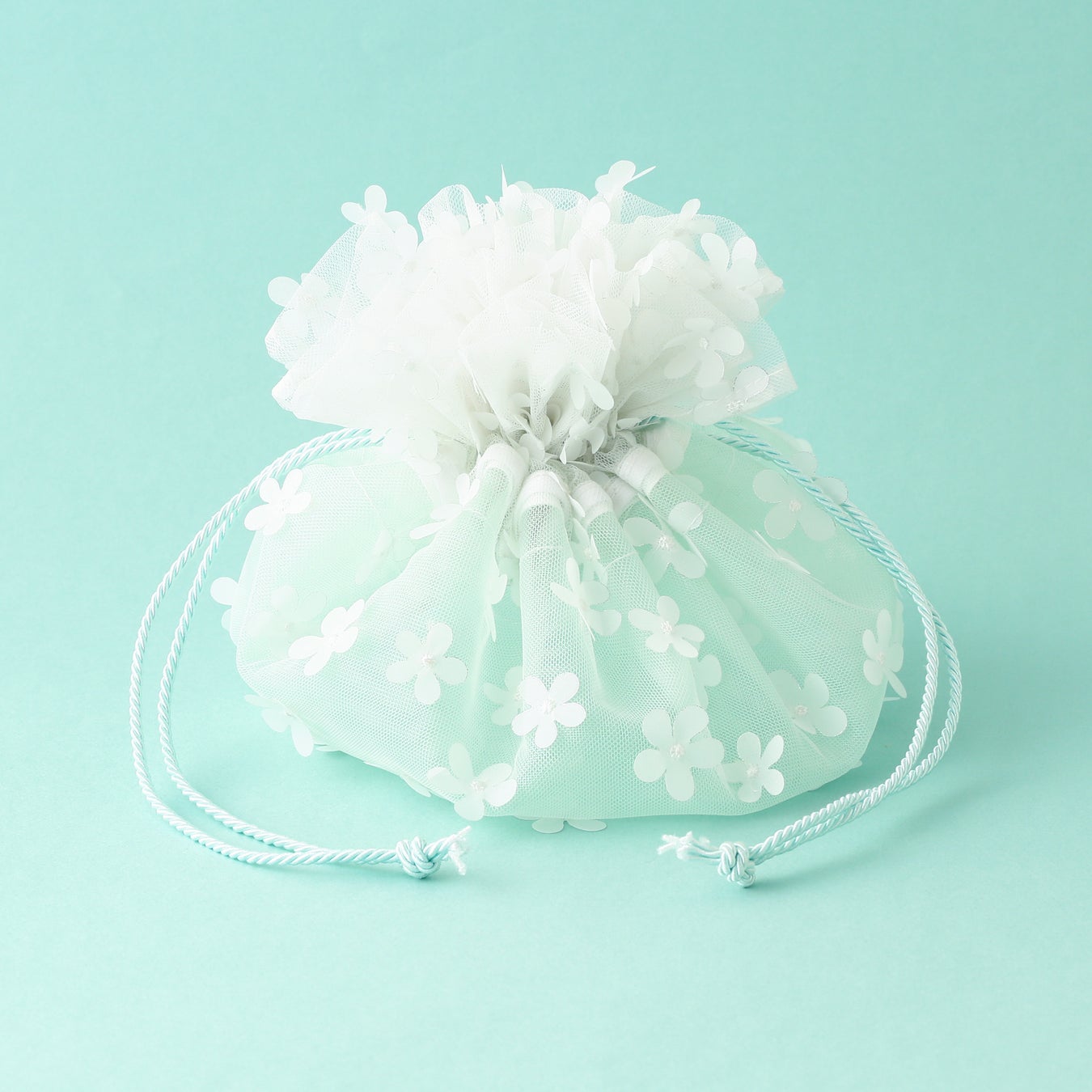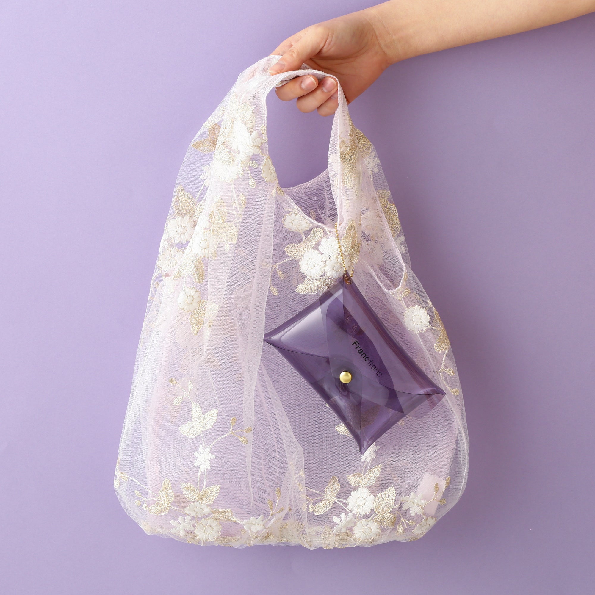チュール素材の透け感に刺繍がフェミニンなミニバッグです。しわを気にせず、くしゅくしゅと丸めて収納できるのが嬉しいポイント。