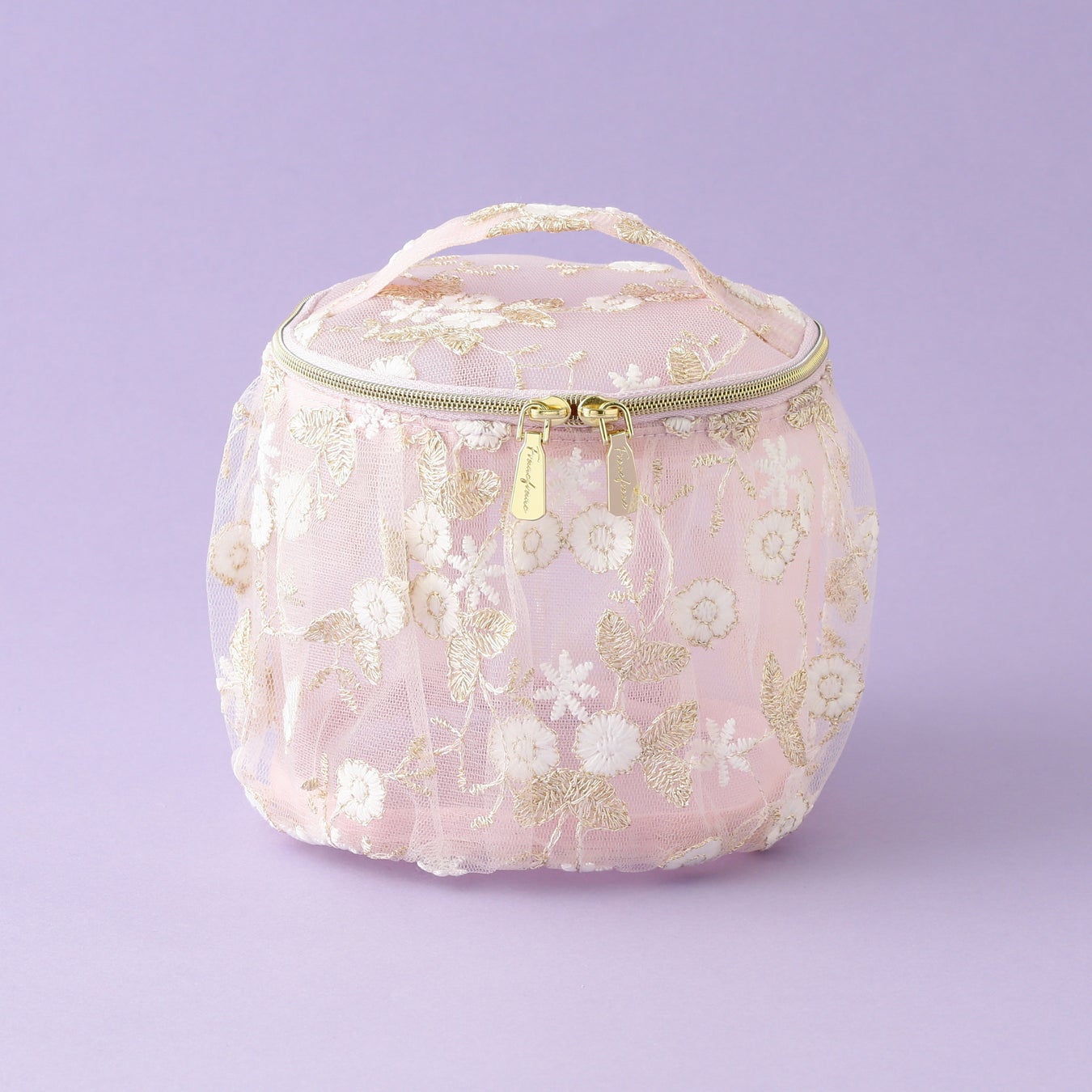 チュール生地を活かしたバニティーポーチです。コロンとした可愛らしいフォルムがポイントです。