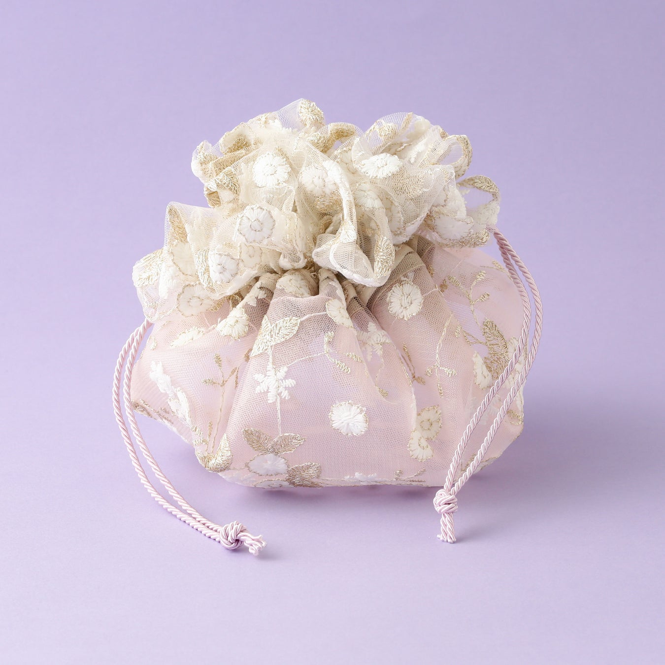 チュール生地を活かした巾着仕様のポーチです。大きく開くことができるので、中身が取り出しやすいのが嬉しいポイントです。