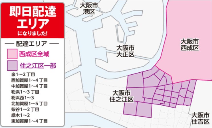 これまで、西成区の一部と住之江区においては、ご注文をいただいてから翌日「2時間枠」のお届けとなっておりましたが、当店の出店により、西成区の全域および住之江区の一部エリアにおいて、当日「1時間枠」のお届けが可能となりました。ビール1本から、重いかさばる商品のお買い物まで、エリア内送料無料でお届けいたしますので是非ご利用ください。