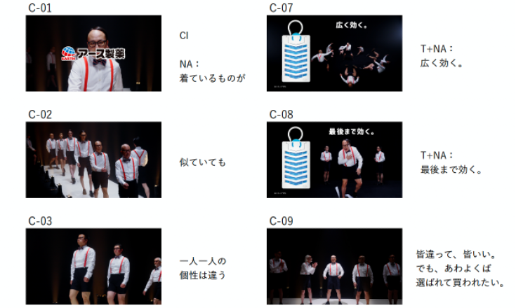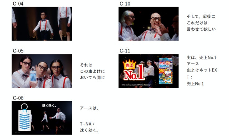 最後には、スポットライトを浴びて喜ぶ様子で、「みんなちがってみんないい」と言いつつも、「売上No.1のアース虫よけネットEXを選んでほしい」という本音を切実に伝えています。たかしさんのモデル顔負けのウォーキング・ポージングがきらりと光ります。また、子どもから、イケメン、老人など多様な姿にふんした、“たかし軍団”も是非ご注目ください。