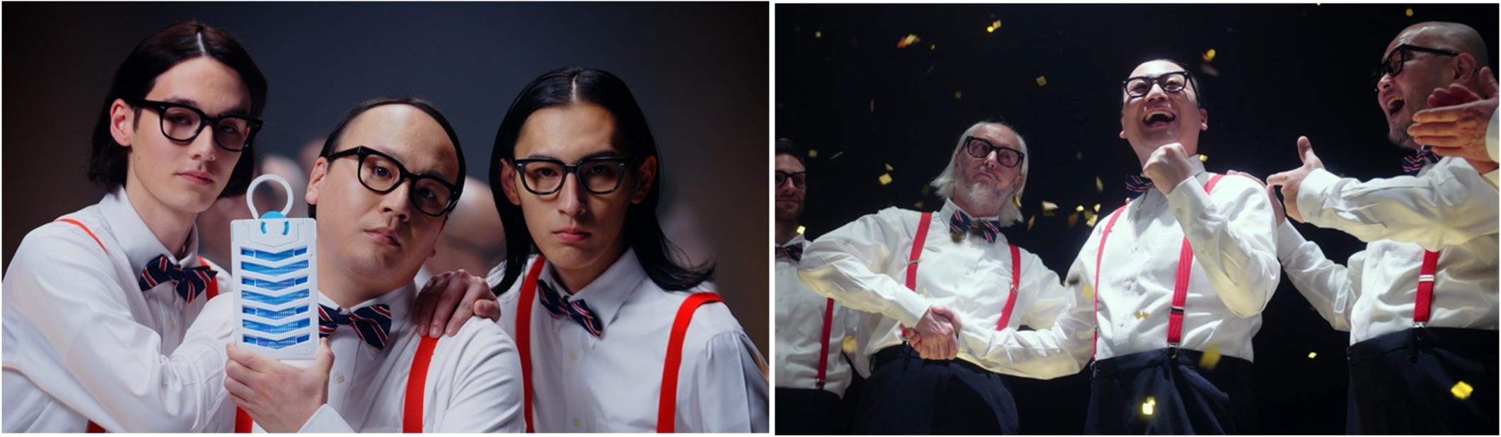 撮影当日、トレードマークである黒いメガネ、赤いサスペンダーと蝶ネクタイ姿で現場入りしたトレンディエンジェル たかしさん。服装がたかしさんそっくりな“たかし軍団”も大集合し撮影がスタートしました。「速く効く、広く効く、最後まで効く」シーンのたかしさんのコミカルな演技に、現場では度々笑いの嵐が起きていました。動画内ではモデル顔負けの堂々としたウォーキングも披露され、おもしろいたかしさんとカッコいいたかしさん、どちらも楽しめる動画になりました。撮影中は、たかしさんと服装がそっくりなエキストラ“たかし軍団”が多数いたため、スタッフがたかしさん本人と見間違える場面も多々。最後にはたかしさんご本人と“たかし軍団”が全員集合して記念撮影をし、終始和やかな雰囲気で終了しました。