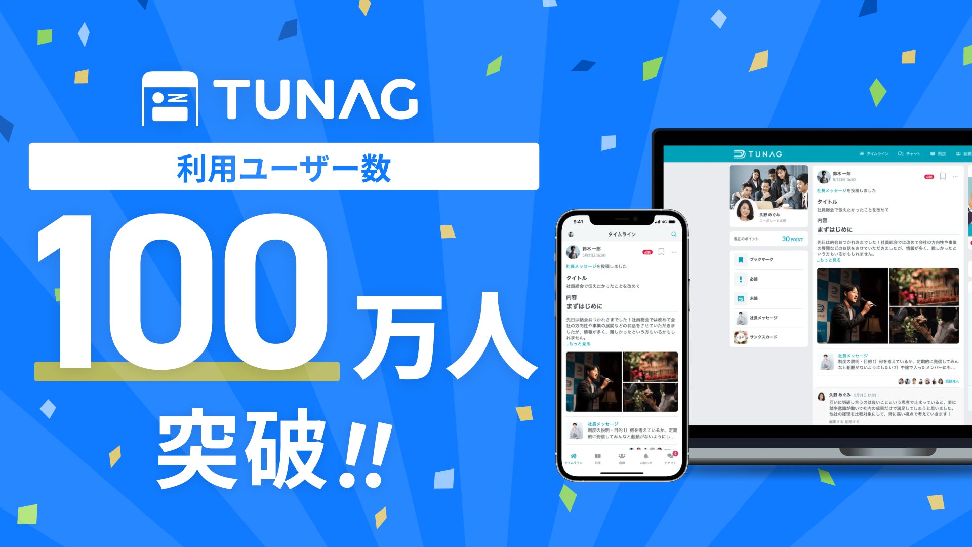 そしてこの度、TUNAG利用ユーザーが100万人という一つの大きな通過点を迎えられたこととても嬉しく思います。