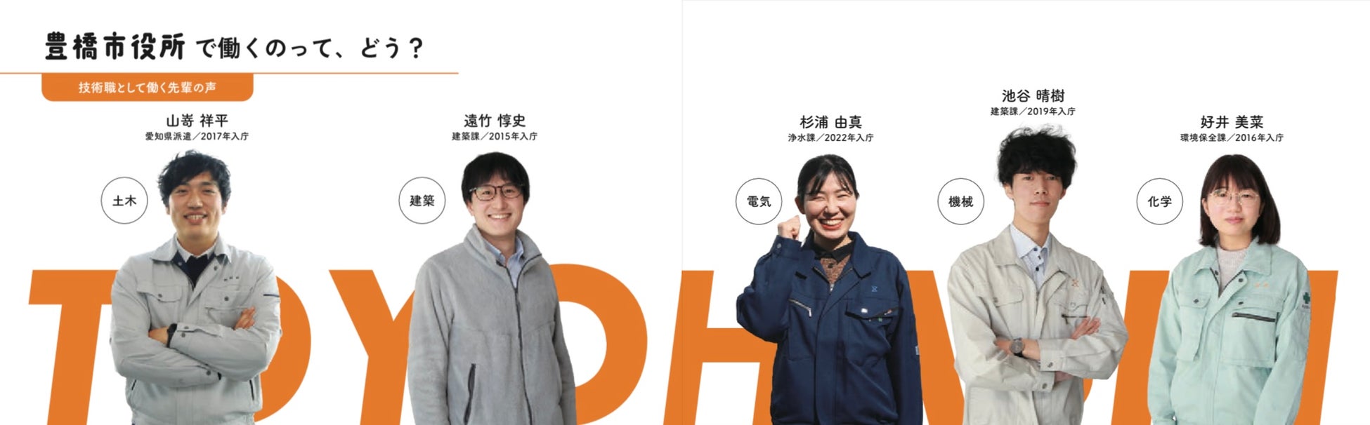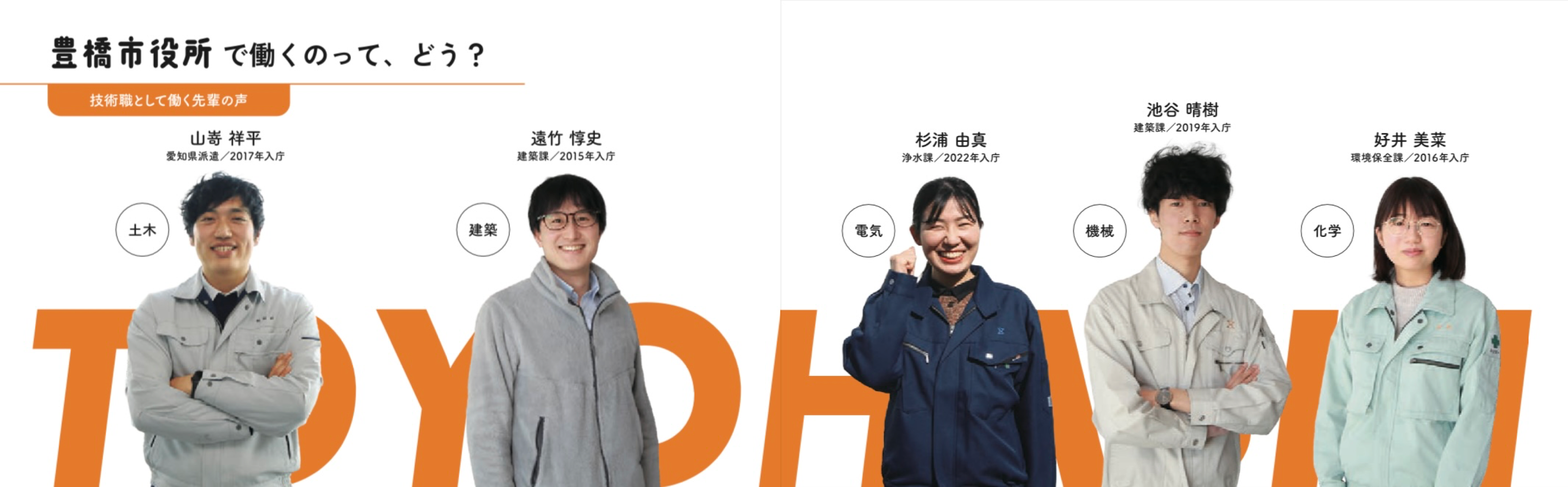 土木、建築のほか、電気、機械、化学の技術職員の計5人が、それぞれの業務や仕事のやりがい、職場の雰囲気などを伝え、市役所の仕事・休日についてイメージがわくものとなっています。