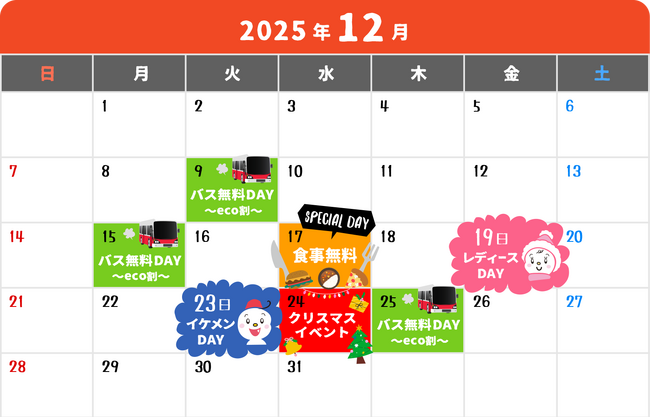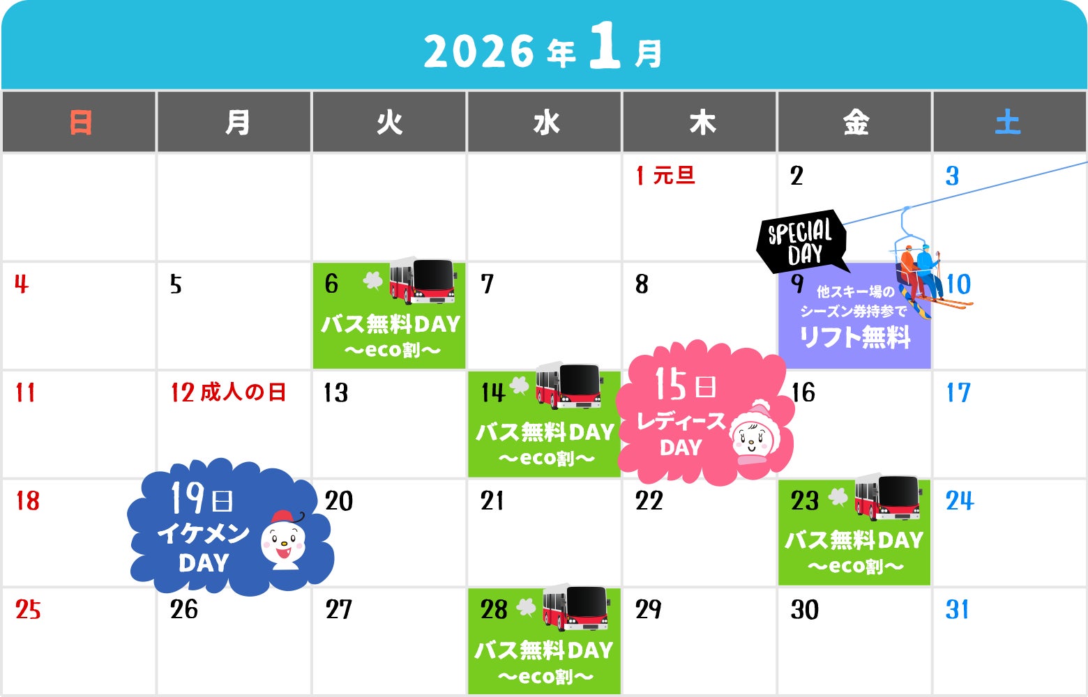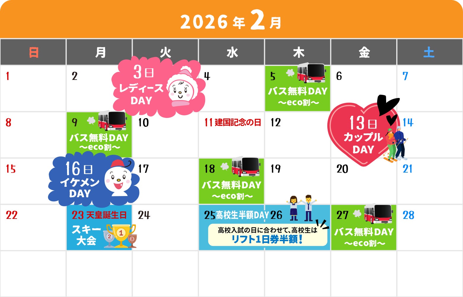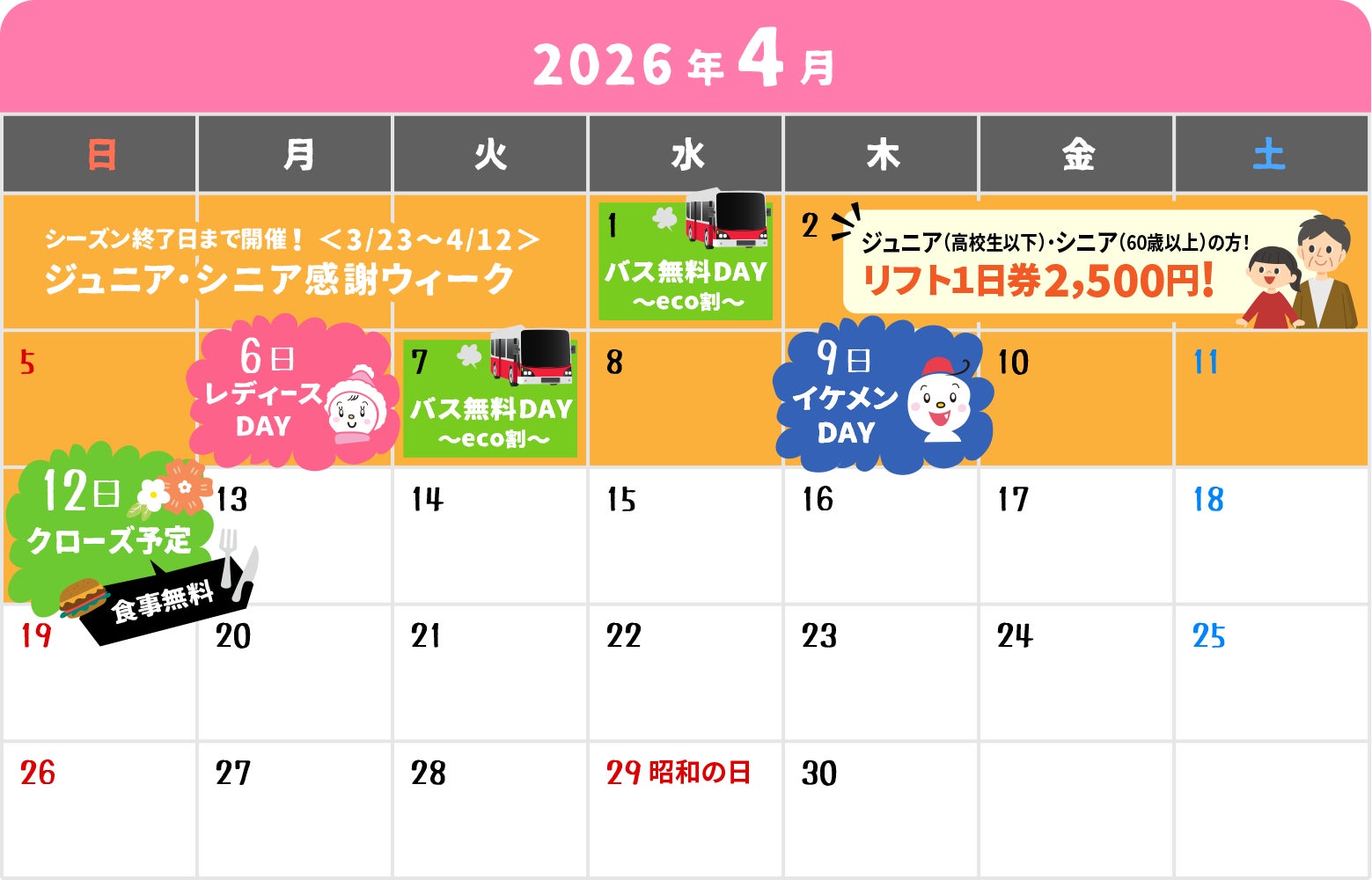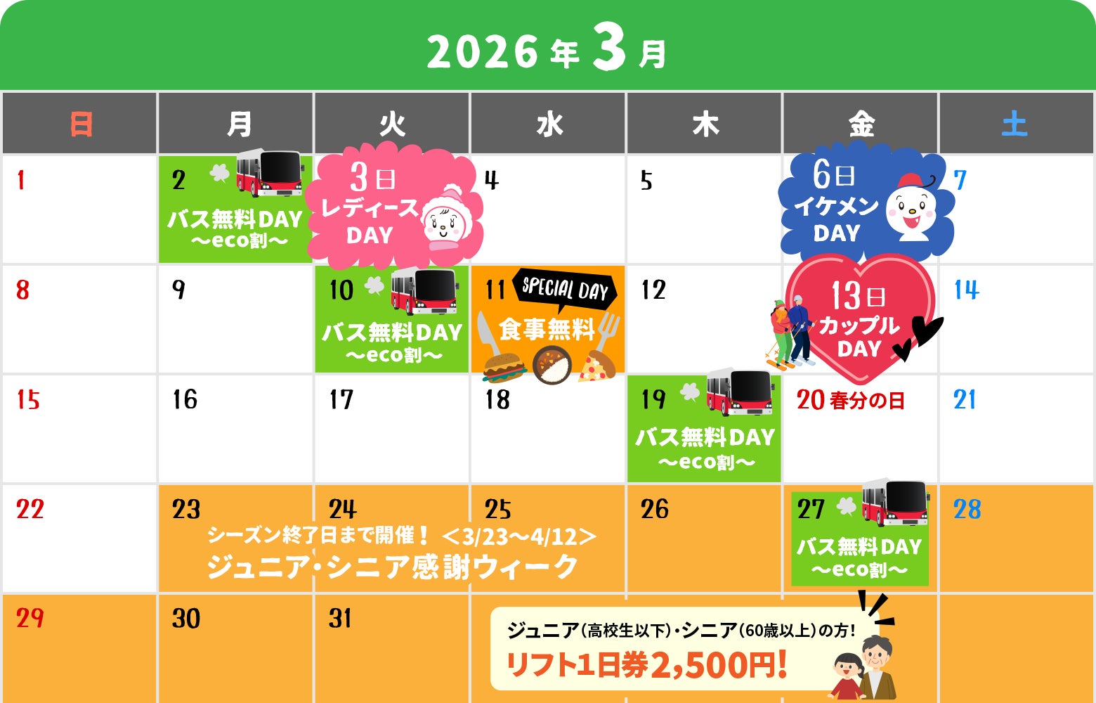 今シーズンもみんなが嬉しい、「リフト券割引」や「食事無料」などの超お得なイベントを「全62回」開催。毎月開催のリフト券割引日「レディースDAY」や「イケメンDAY」に加えて、総額5000万円還元キャンペーンとして「バス無料DAY」も17回、レストランの80種類のメニューが何度でも無料で食べ放題となる「食事無料日」も4回開催します。