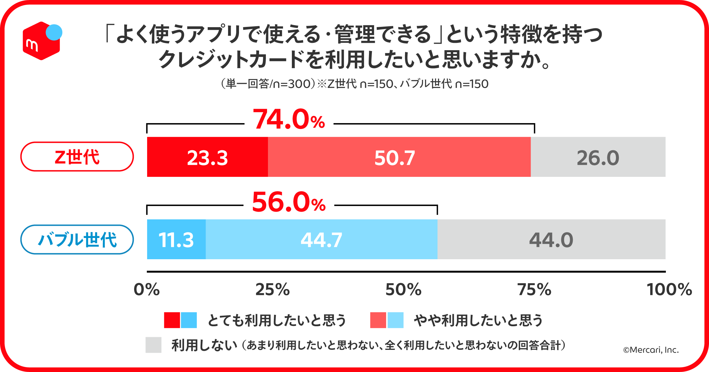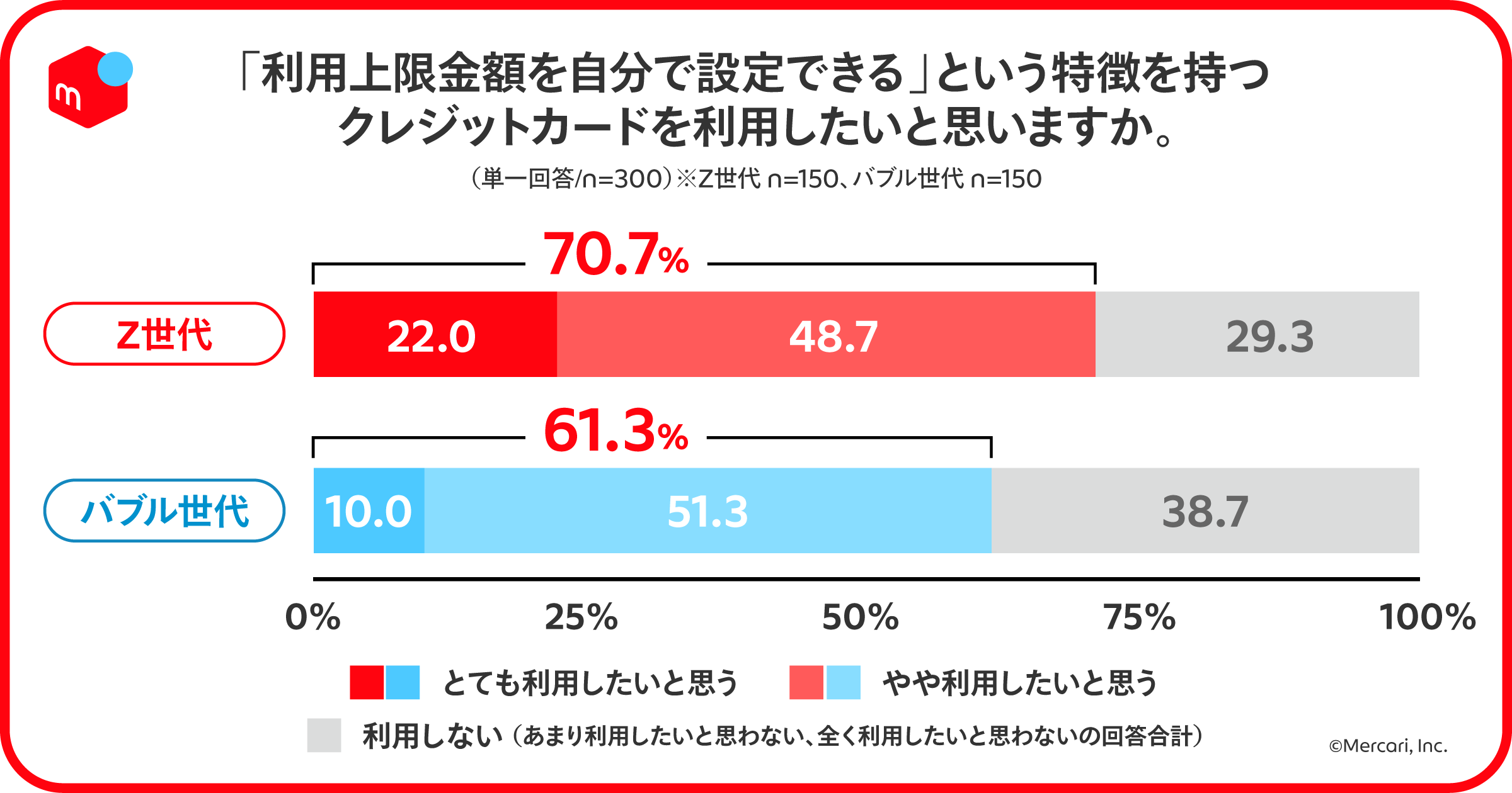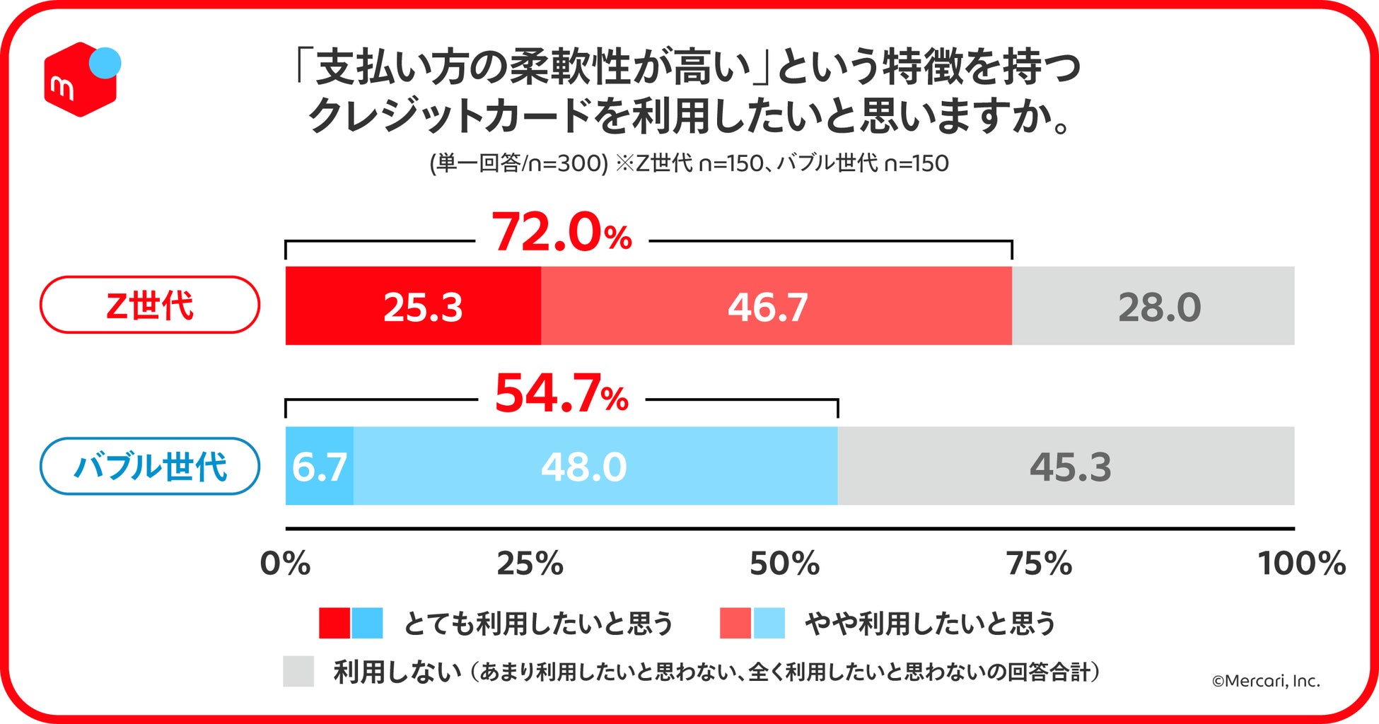 利用したいクレジットカードの特長としてZ世代とバブル世代で意識の差が大きい項目を見たところ、「よく使うアプリで使える・管理できる(Z世代72.0%:バブル世代54.7%)」、「支払い方の柔軟性が高い(Z世代74.0%:バブル世代56.0%)」、「利用上限金額を自分で設定できる(Z世代70.7%:バブル世代61.3%)」など、自身で利用を管理しやすいかどうかという点が多く、Z世代の方が管理・把握したいというニーズがあることが伺える結果に。