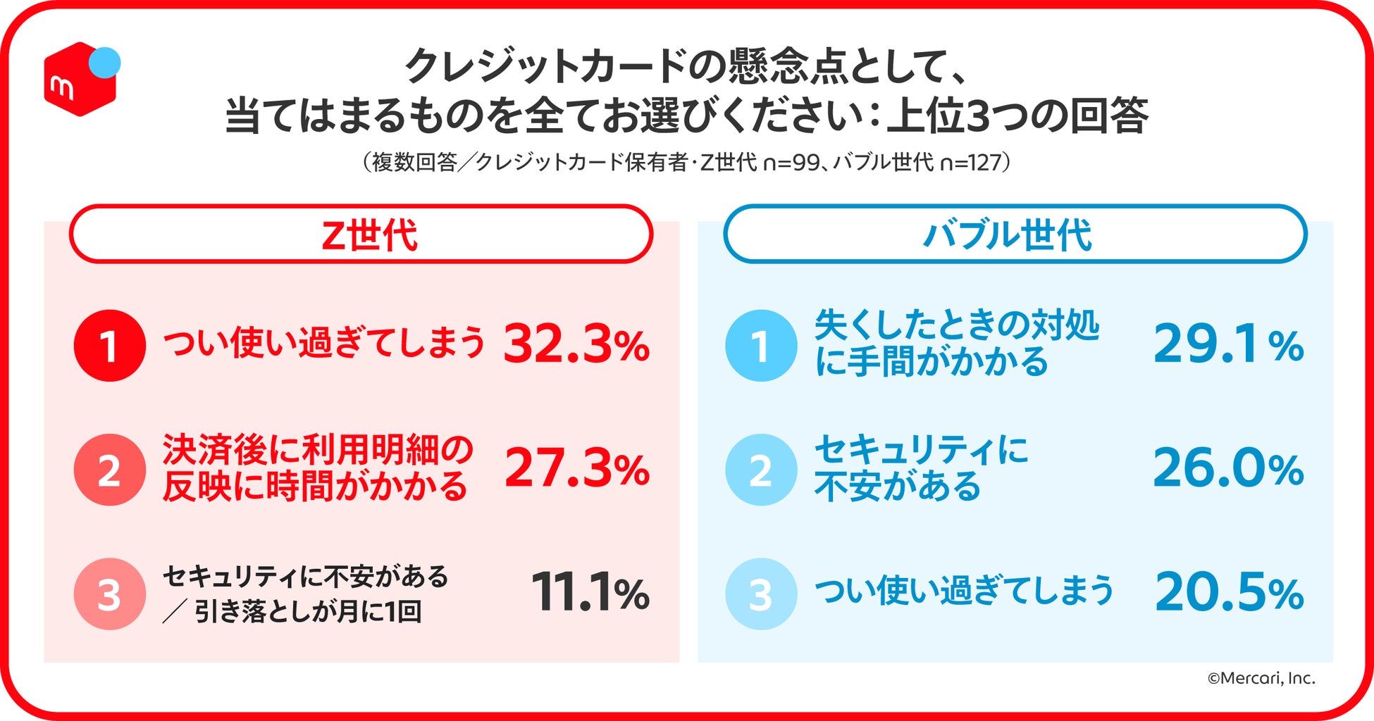 クレジットカードの懸念点を聞いたところ、バブル世代は、「失くしたときの対処に手間がかかる(29.1%)」、「セキュリティに不安がある(26.0%)」とセキュリティ面が上位であったが、Z世代は、「つい使い過ぎてしまう(32.3%)」と「決済後に利用明細の反映に時間がかかる(27.3%)」がそれぞれ約3割と上位であり、利用と管理ができないことへの懸念が大きい傾向に。