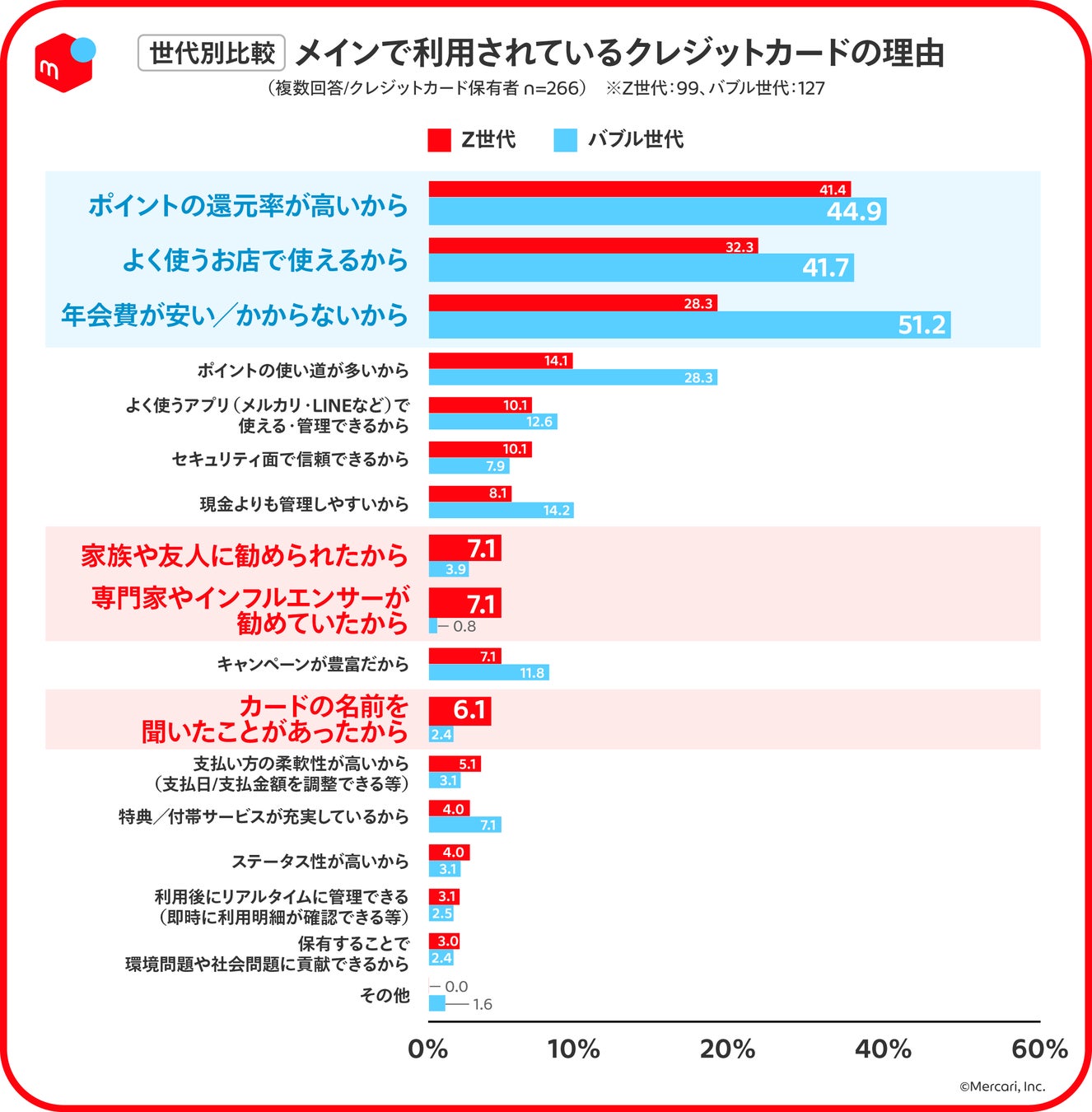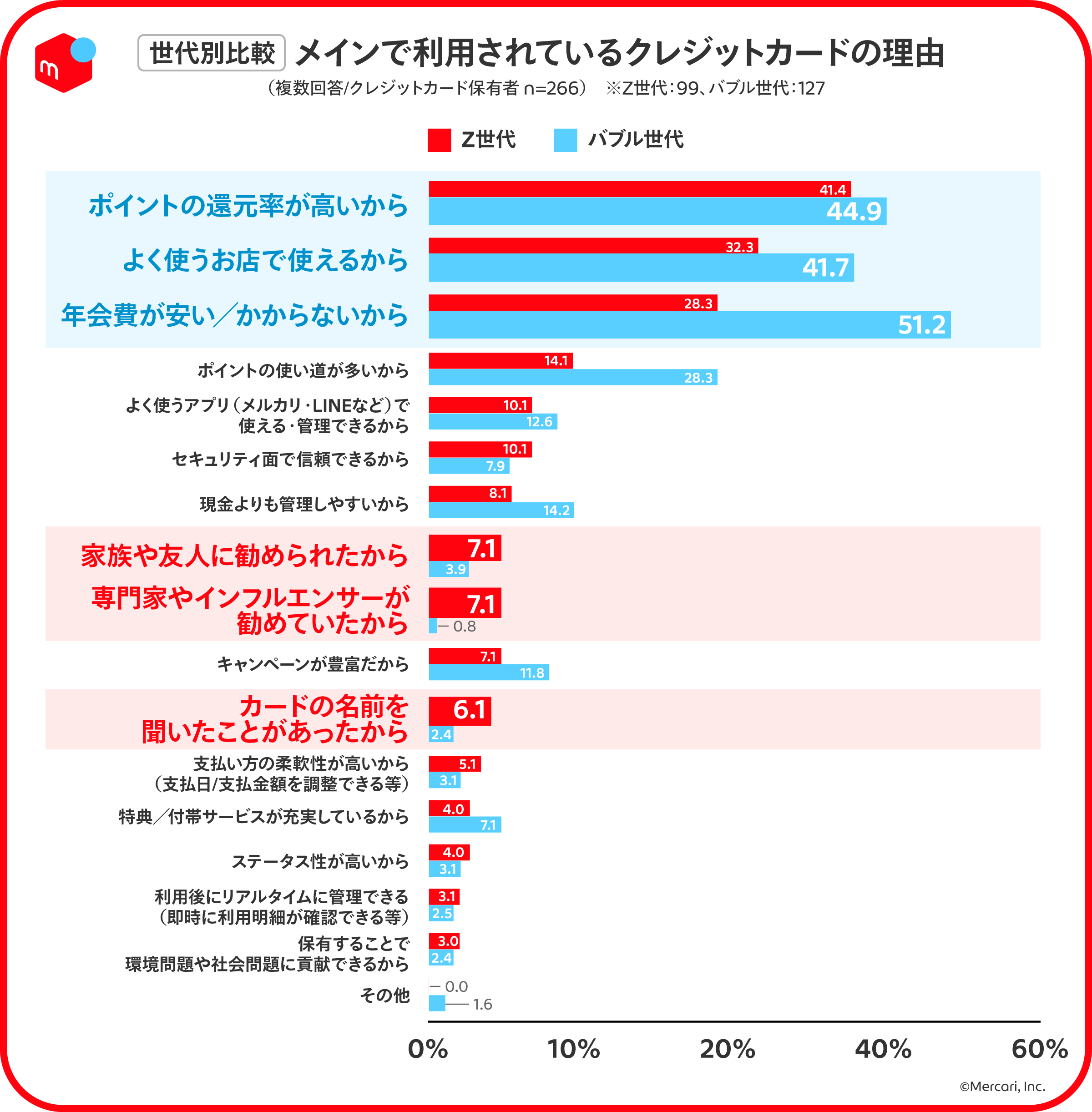 お得で選択する傾向は、バブル世代が特に顕著で、「年会費が安い/かからないから(51.2%)」、「ポイントの還元率が高いから(44.9%)」という回答。