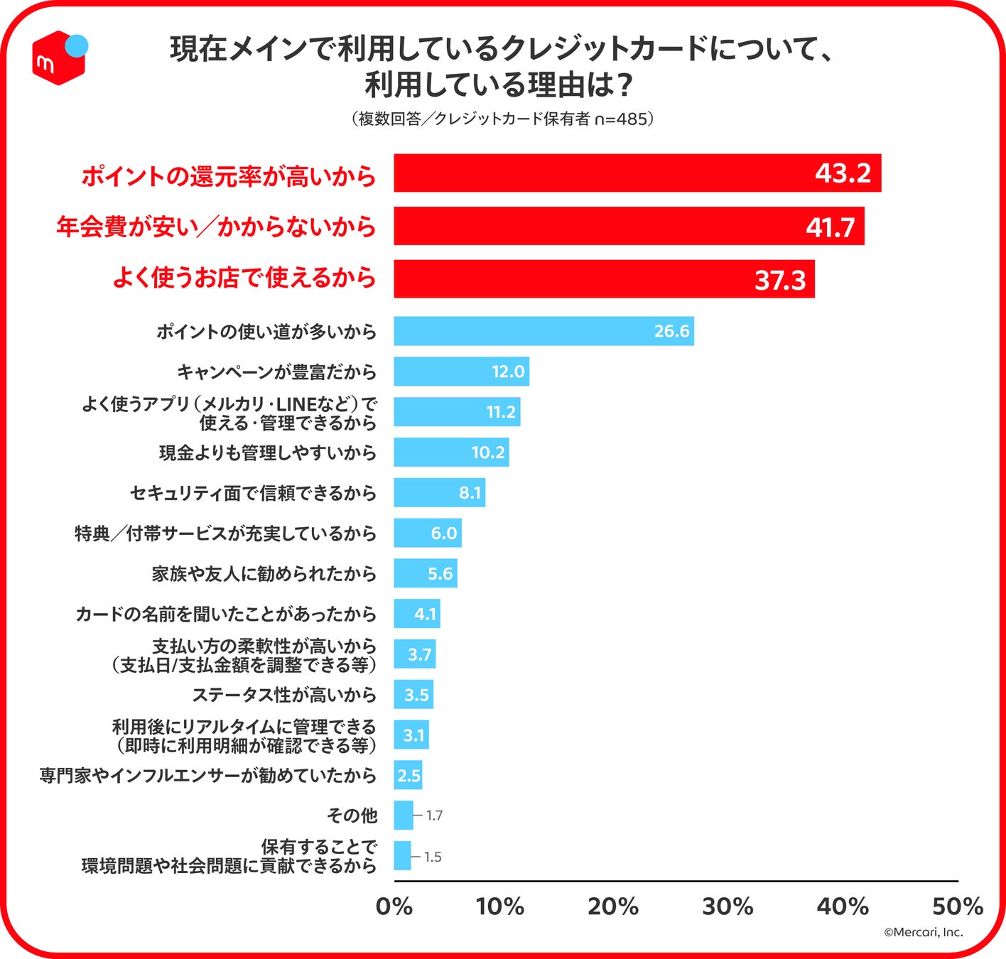 現在メインで利用しているクレジットカードの選択理由については、全世代では、上位から、「ポイントの還元率が高いから(43.2%)」、「年会費が安い/かからないから(41.7%)」とお得かどうかが選択理由の上位に。