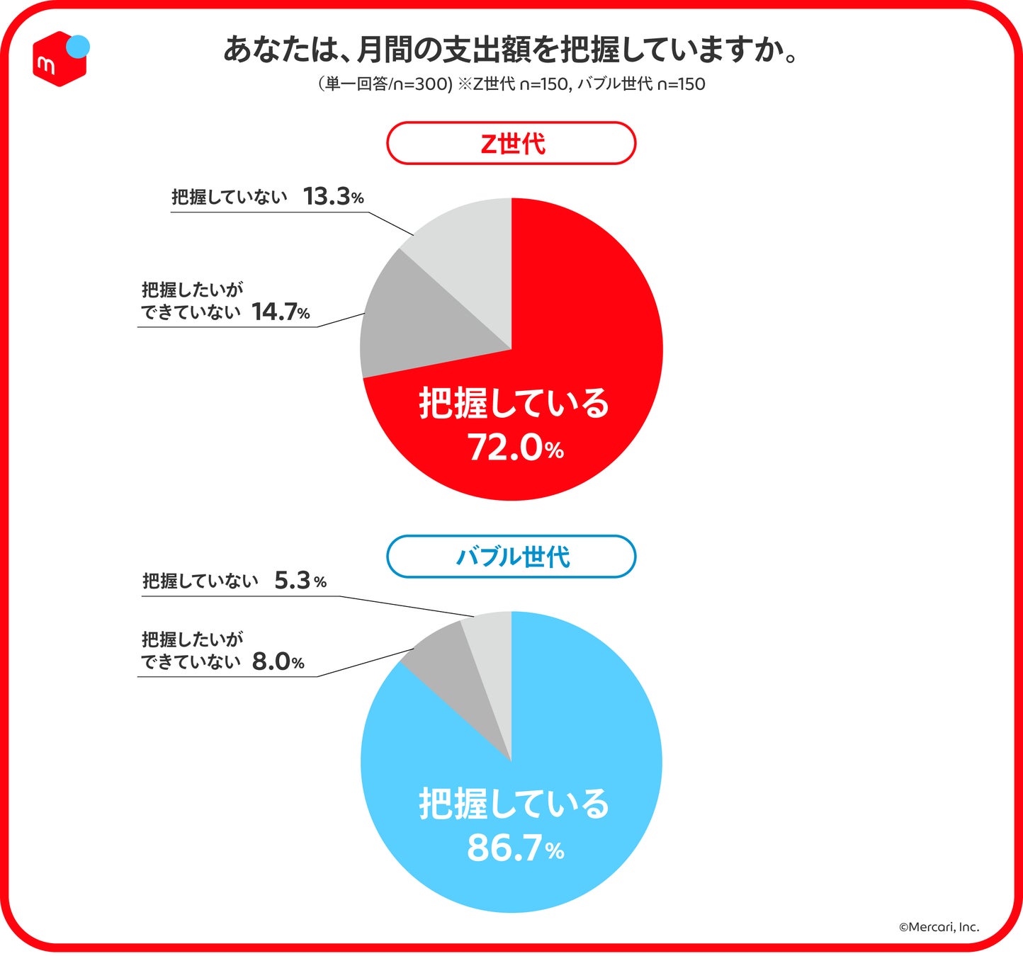 一方で、月々の支出額を把握しているかという問いについては、バブル世代は86.6%が把握していると回答する一方で、Z世代は72.0%と相対的に把握できていない傾向に。