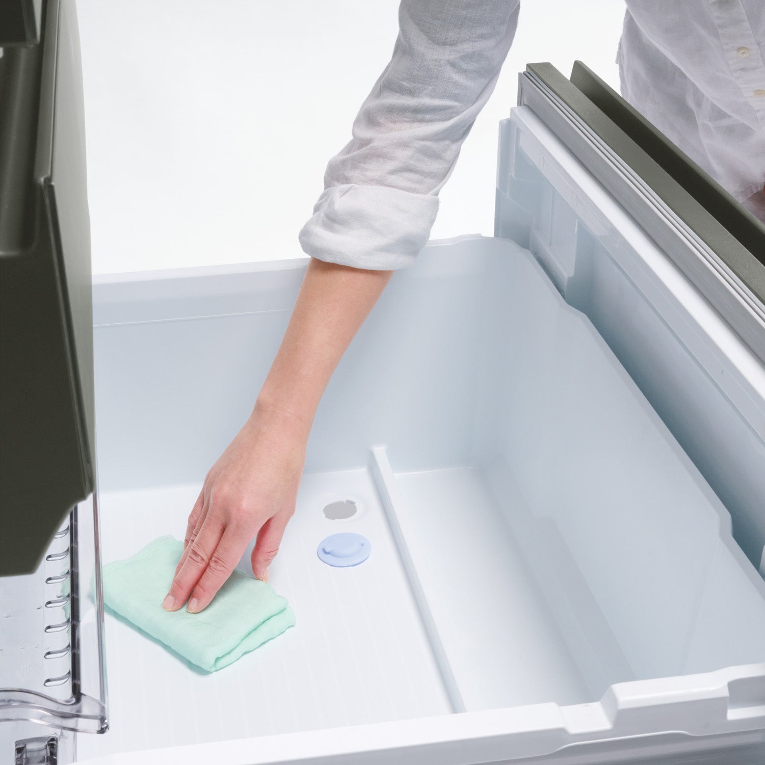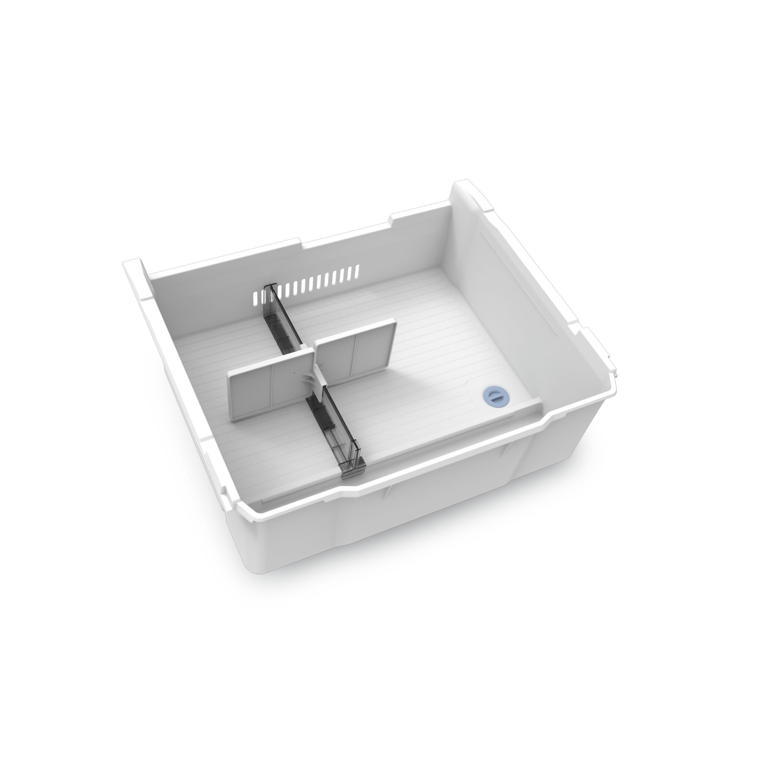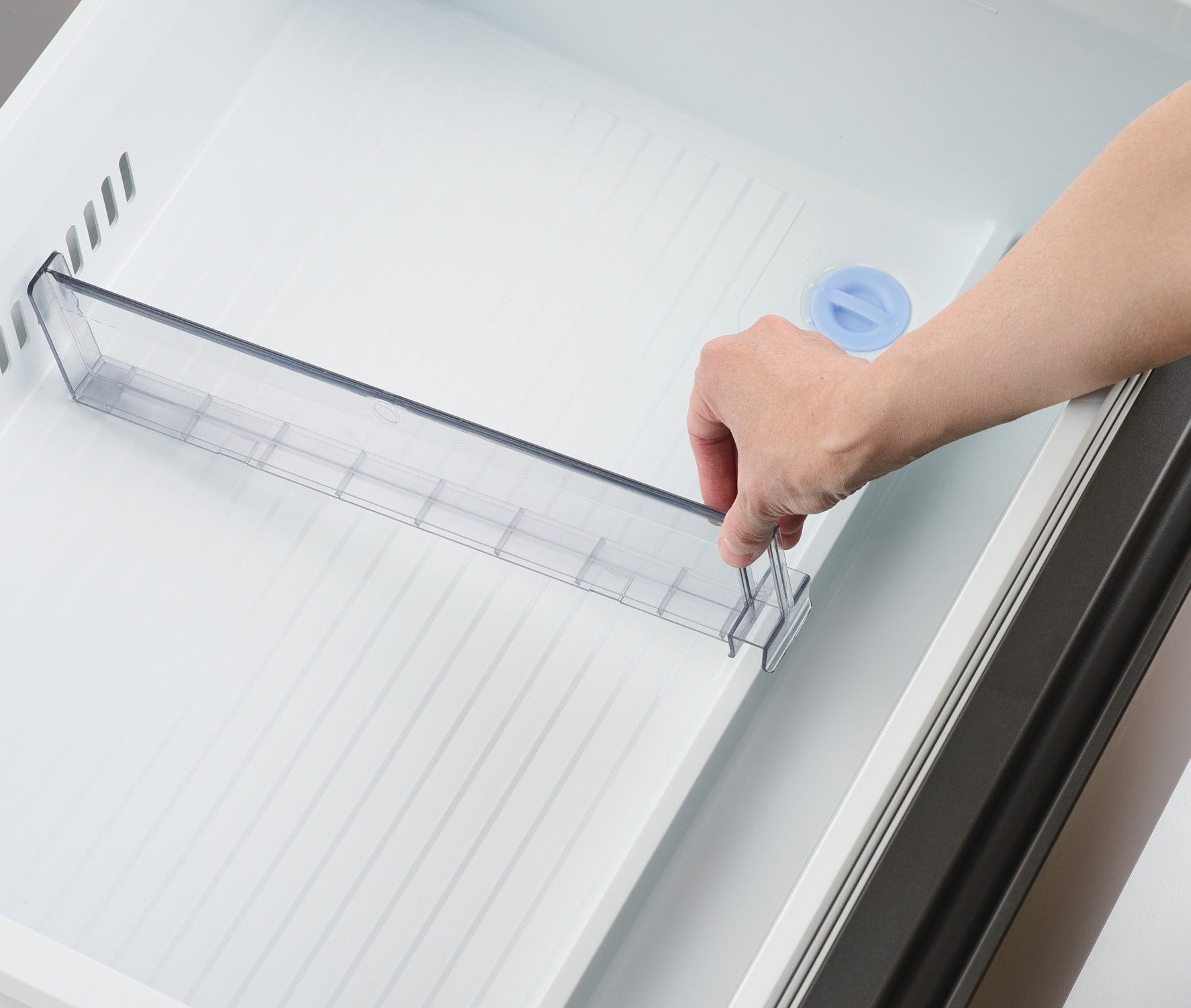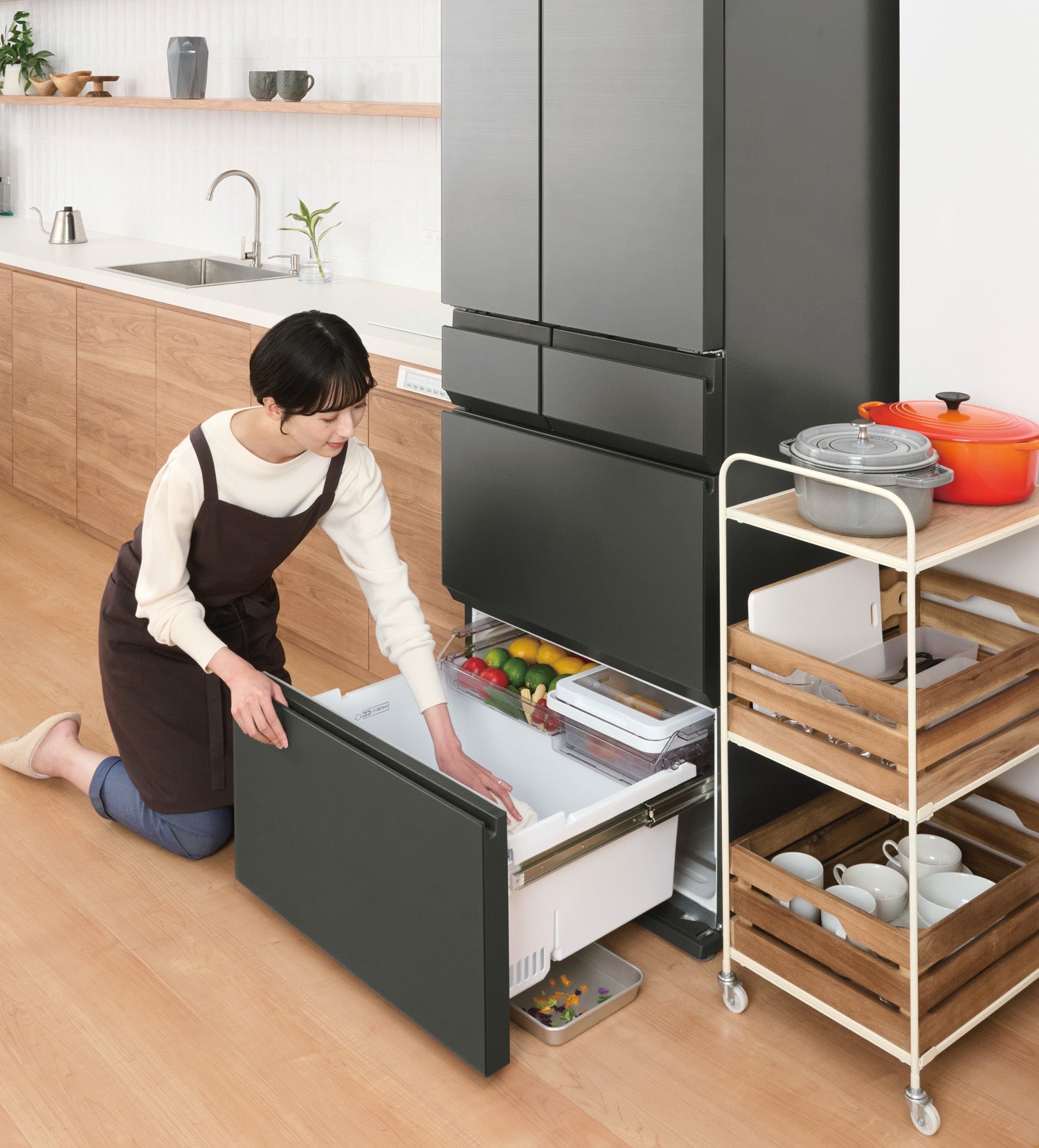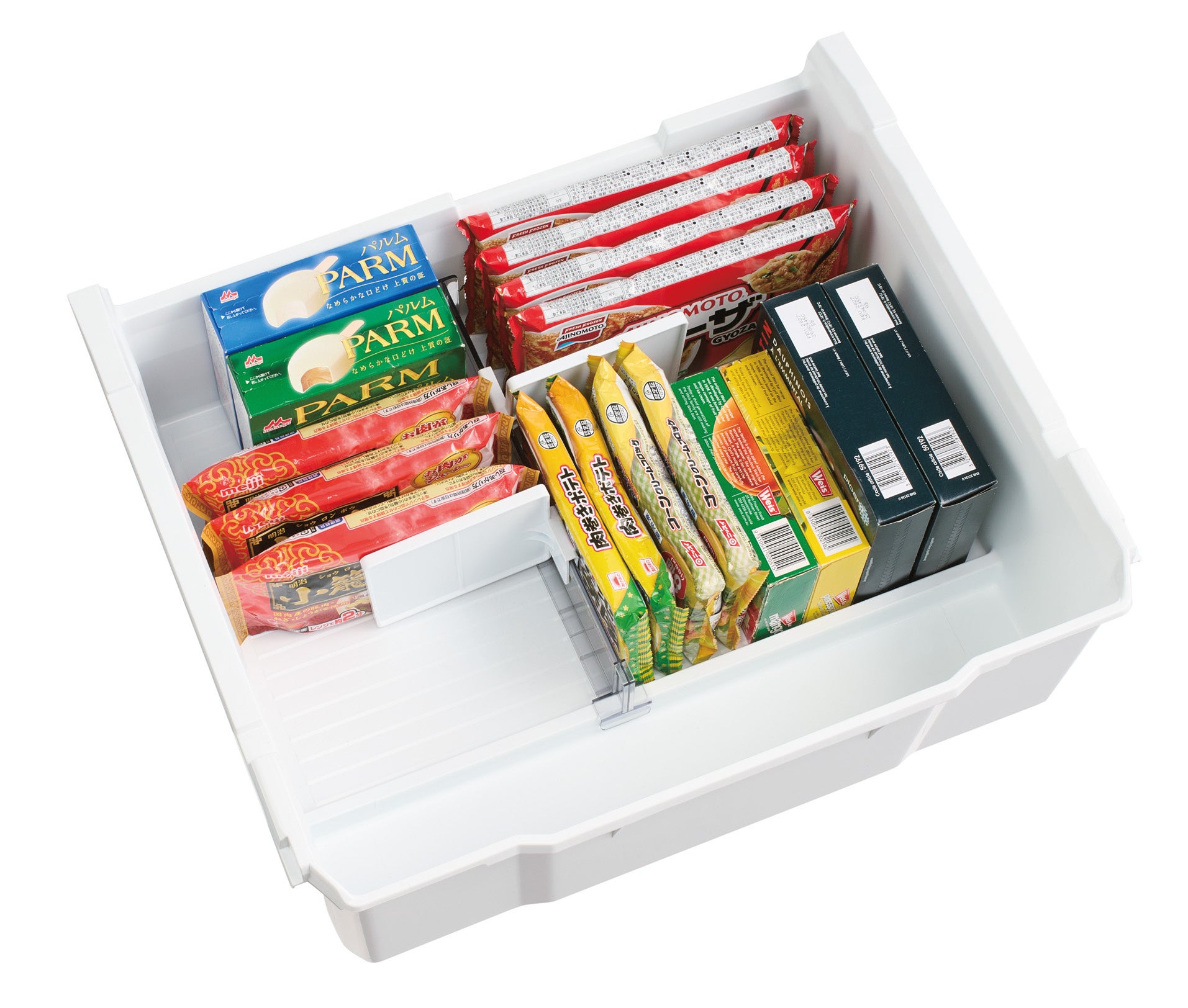 本シリーズでは、業界トップクラス182Lの大容量冷凍室をまんなかに配置。腰をかがめずラクに食材の出し入れができます。また、冷凍室内は整理しやすい3段ケースを採用。加えて下段には自由に位置を変えられる仕切りを設置することで、大きな箱入りのアイスケーキから作り置きした料理まで、用途やサイズに合わせてすっきり収納できます。